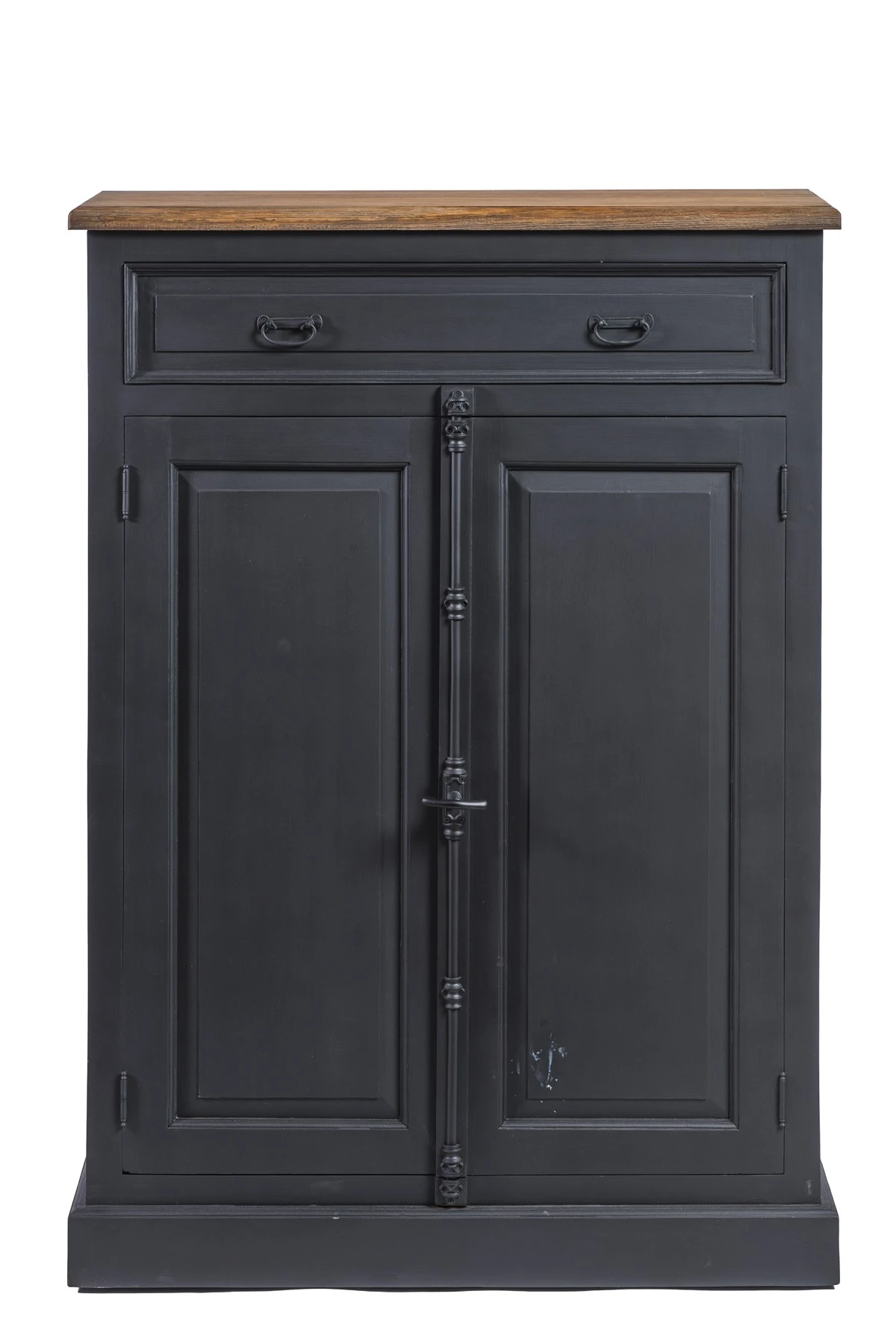 De bar MELINDA met 2 deuren en 1 lade is uitgevoerd in zwart en de bovenste plank is van massief hout en teak fineer. De structuur is van massief hout Damar. De structuur van deuren is gemaakt van mahoniehout. De handvatten zijn van zwart metaal. De combinatie van zwart en hout geeft het meubel een elegante uitstraling,