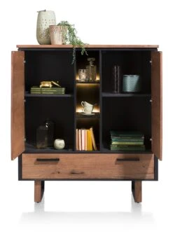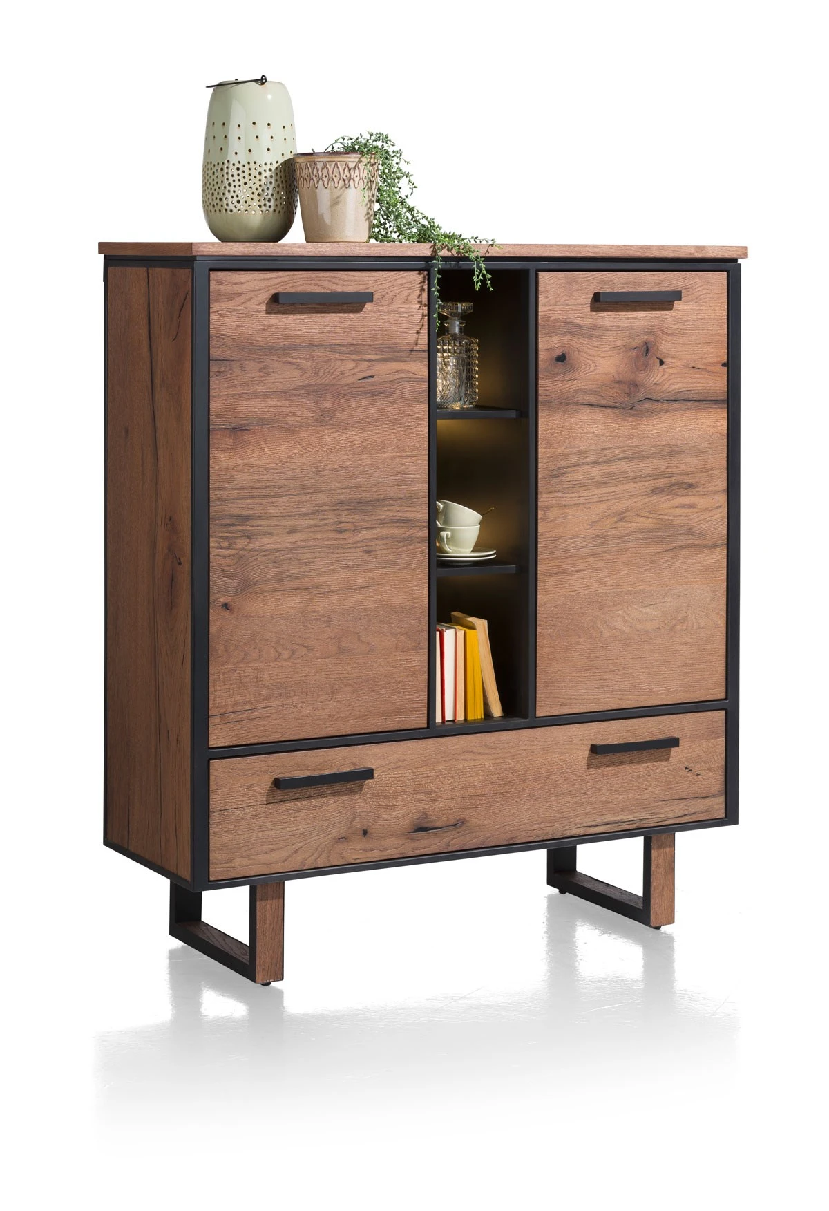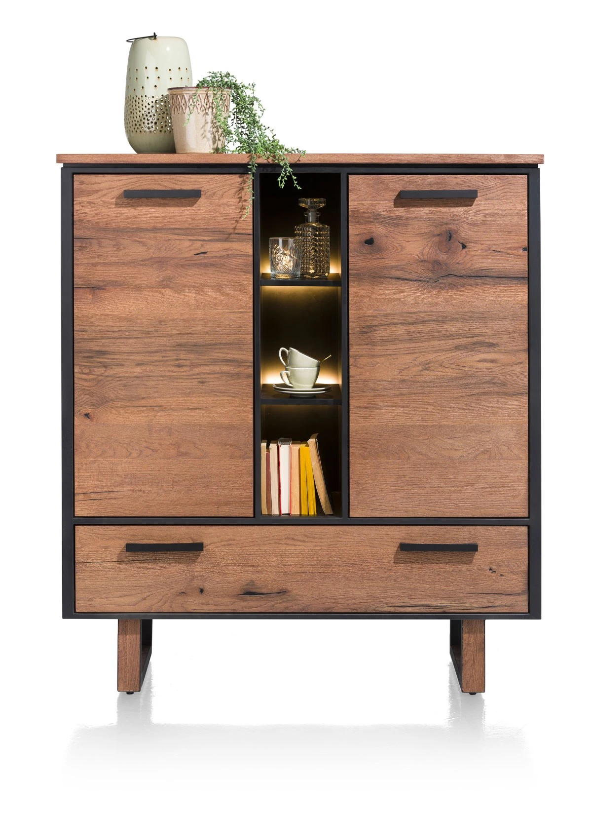 Een moderne bar in industriële stijl ! Deze maakt deel uit van de collectie OXFORD, in fineer eik met details in metaal. De bar OXFORD heeft 2 deuren, 1 lade en 3 nissen met inbegrepen LED verlichting. De poten zijn omkeerbaar, zo kan je zelf kiezen tussen de poten in houtlook of metaal. Dit meubel fleurt je interieur op !