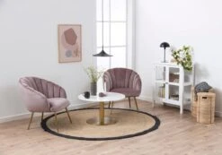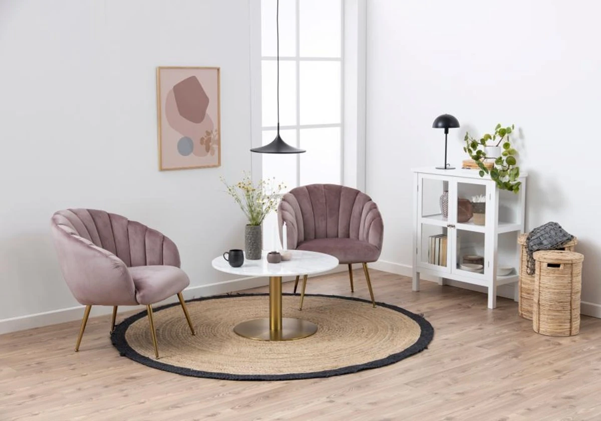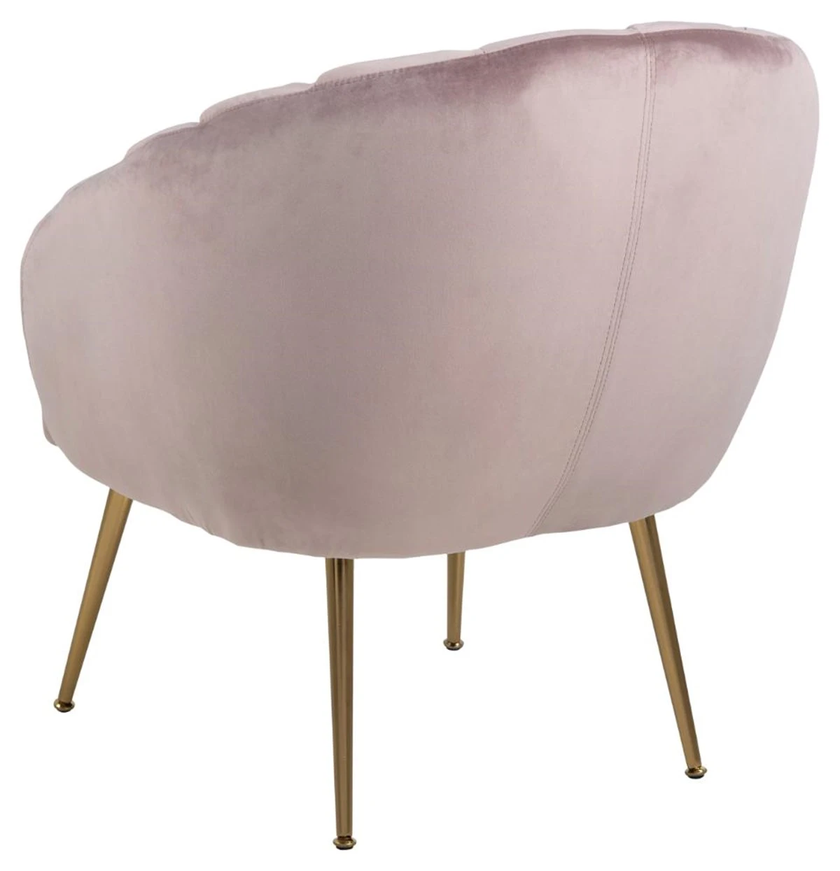 De bijzetzetel DANIELLA of loungestoel in roze stof met zijn messingkleurige poten past perfect bij je interieur.