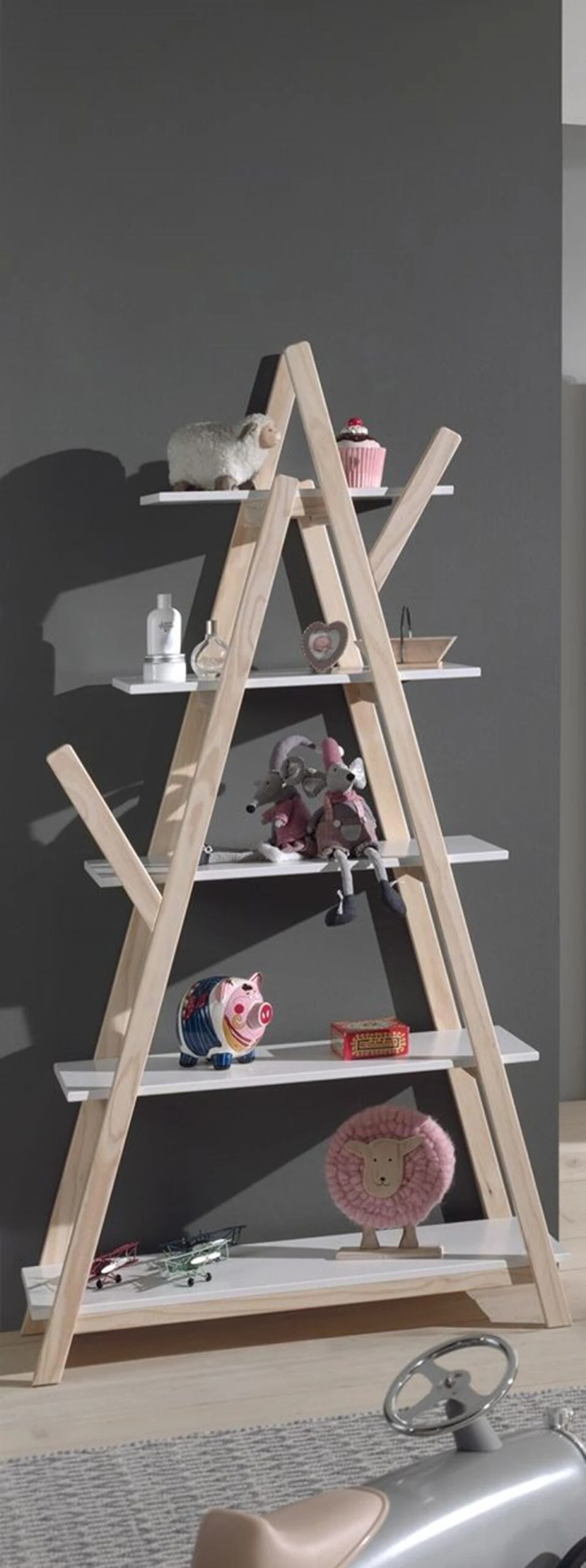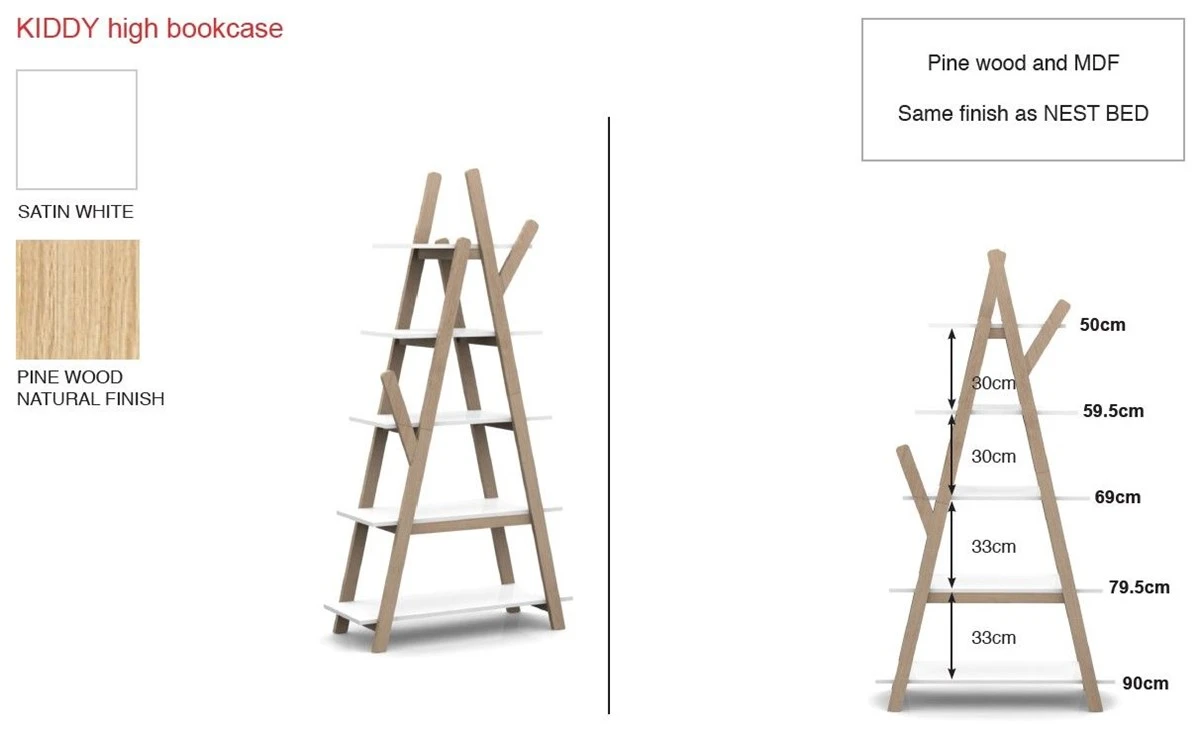 Stijlvolle boekenkast met een scandinavisch karakter. De boekenkast KIDDY is gerealiseerd in gelakte MDF. Deze trendy open boekenkast heeft de vorm van een tipi en is voorzien van 5 legplanken waarop je ruimte genoeg hebt om allerlei voorwerpen uit te stallen. Combineer deze boekenkast Kiddy met andere meubels uit dezelfde serie.