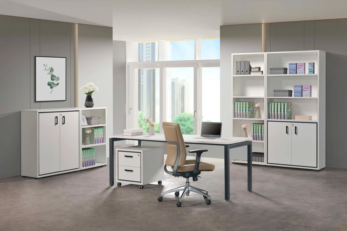 Praktische lage boekenkast ALTIS met hoogte 112cm die dankzij zijn neutrale polar white kleur bij heel wat interieurstijlen past. Combineer deze lage boekenkast met de andere meubelen uit dit bureauprogramma.