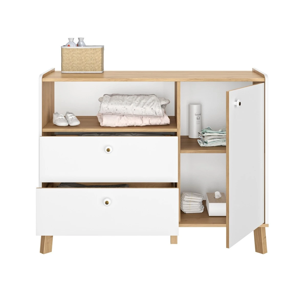 Met de ALBA commode heb je alles wat je nodig hebt om de kleren en favoriete accessoires op te bergen. Deze commode heeft één deur, 2 lades en 1 open vak. Praktisch, hè! De commode is gemaakt in decor artisan oak gecombineerd met wit. Combineer deze commode met de andere meubelen in de ALBA kinderkamer.