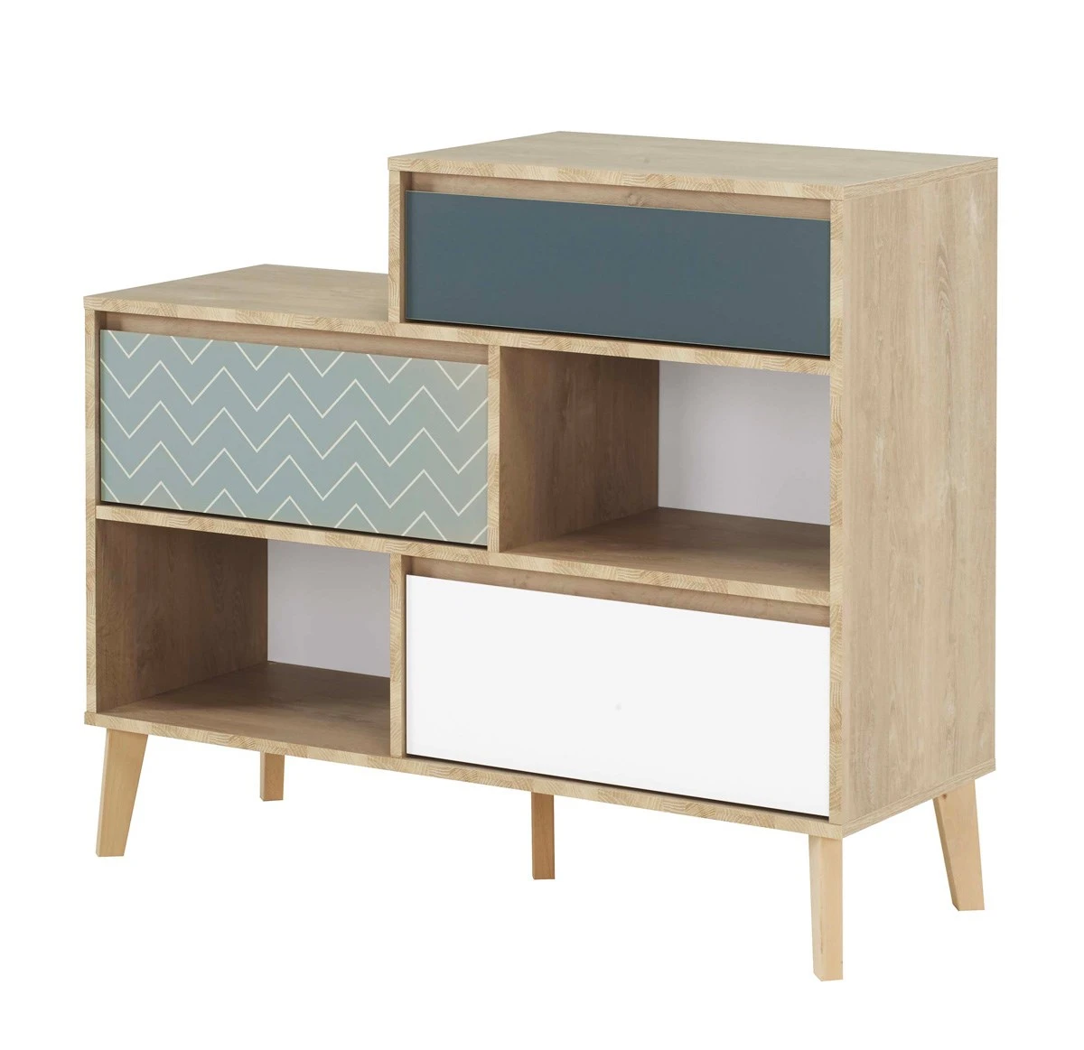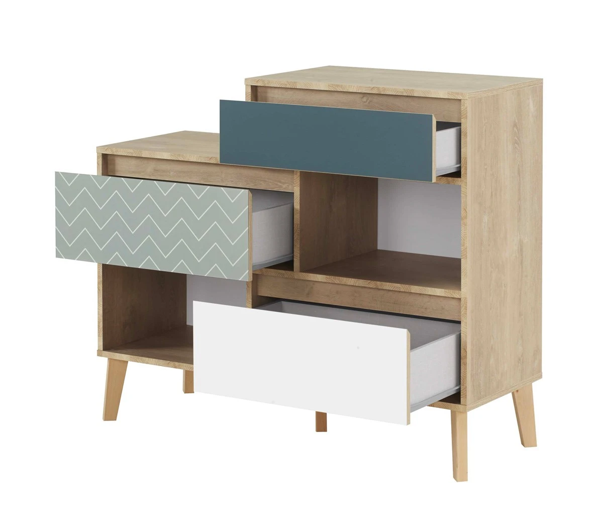 Scandinavisch design, kleurrijk en fris voor deze heel trendy en kleurrijke commode LARVIK, gerealiseerd in decor imitatie hout ! Combineer de commode Larvik, voorzien van 3 lades en 2 nissen, met andere meubels uit dezelfde serie.