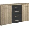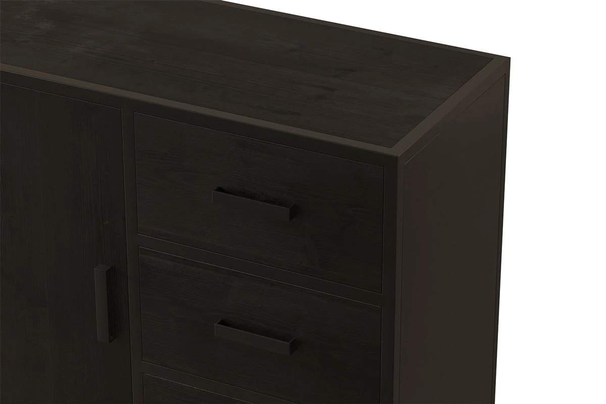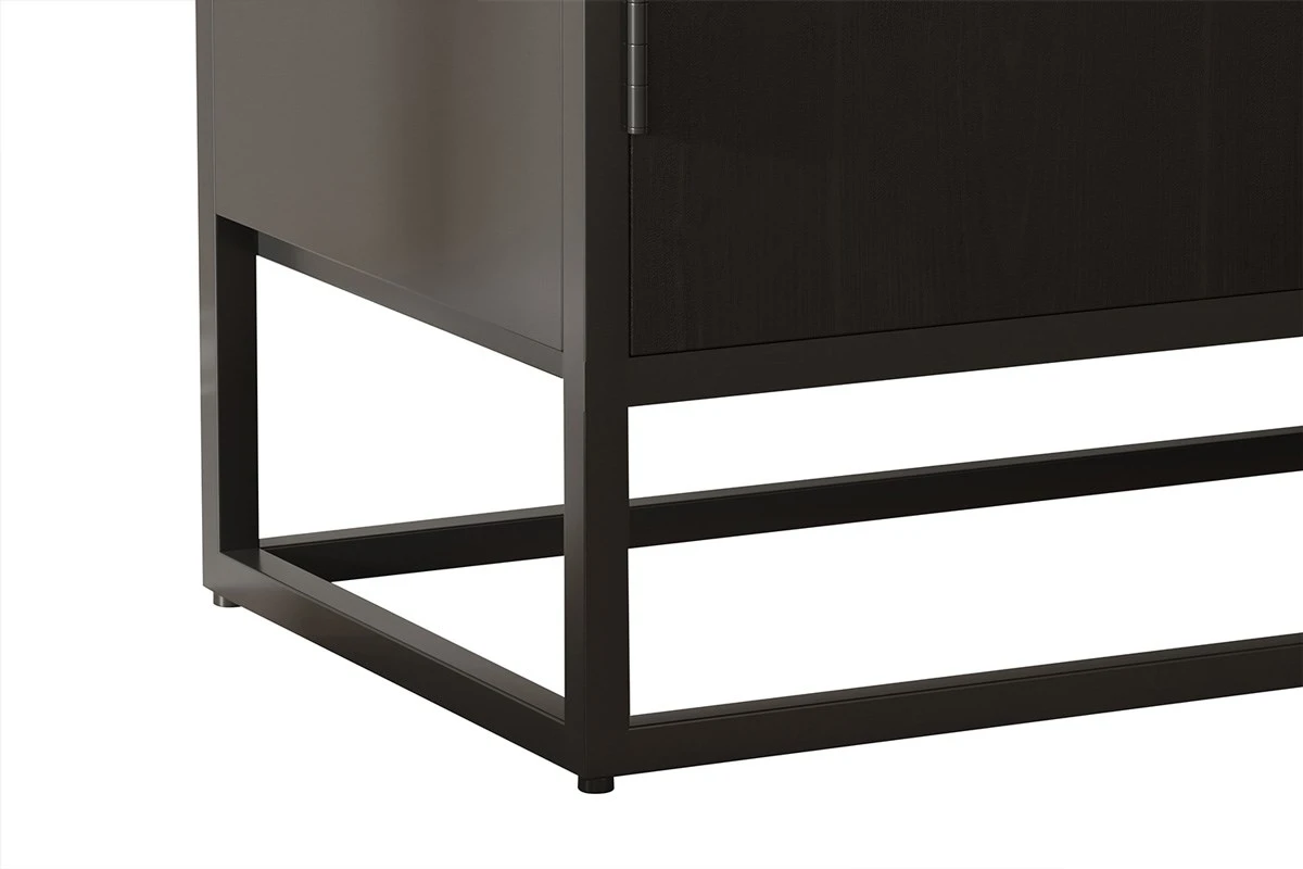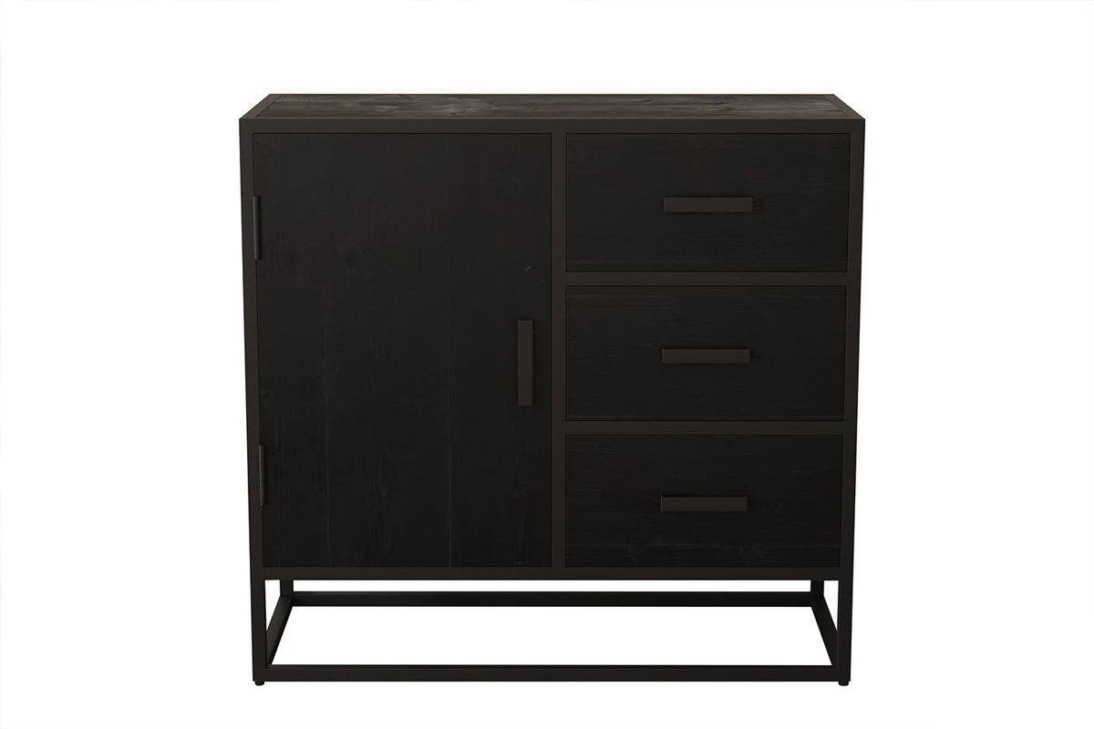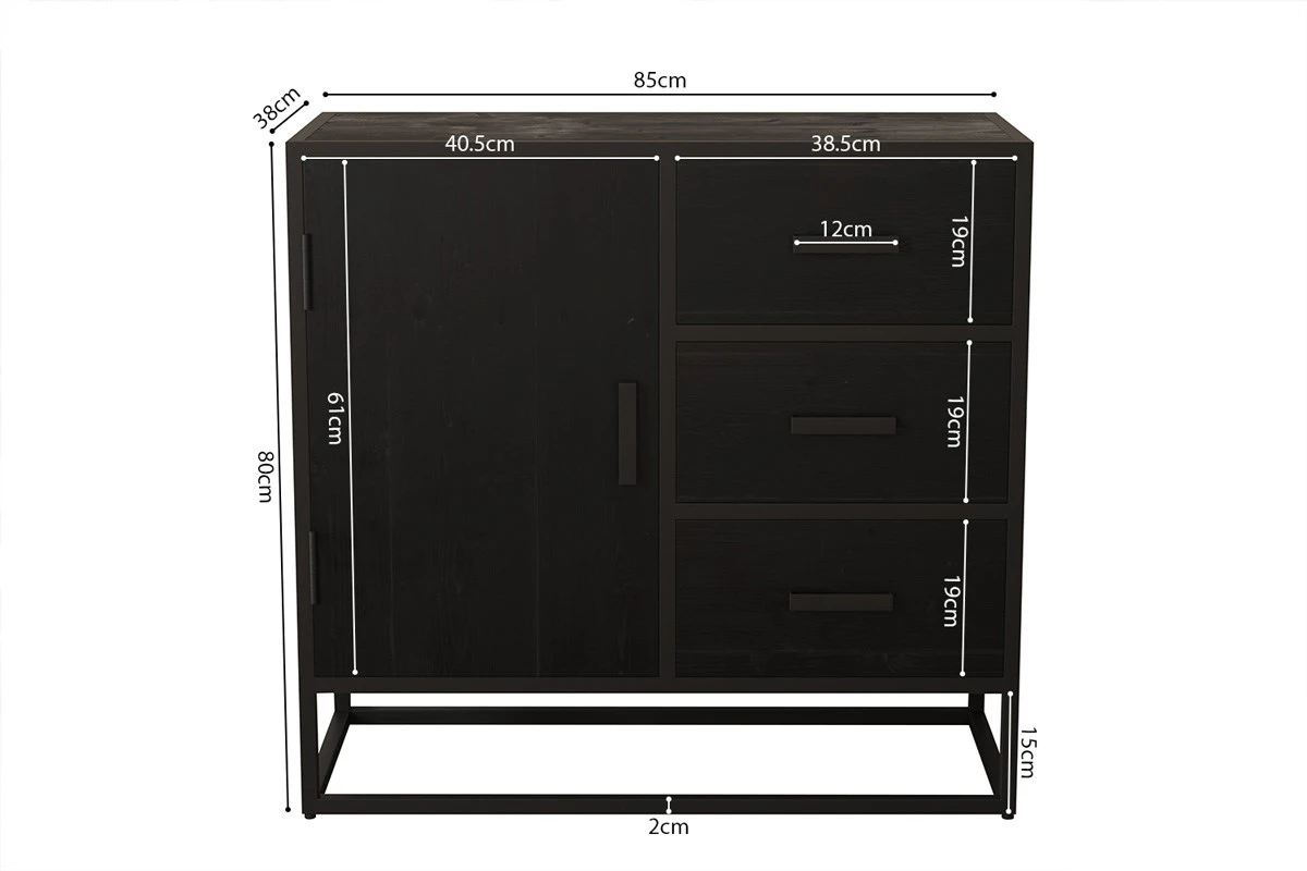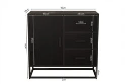 De commode MADEIRA met lengte 85cm heeft een stevige zwart metalen structuur en een blad van exotisch zwart mangoliahout. Stijlvol en ook nog eens erg praktisch dankzij zijn 3 deuren en 1 deur.