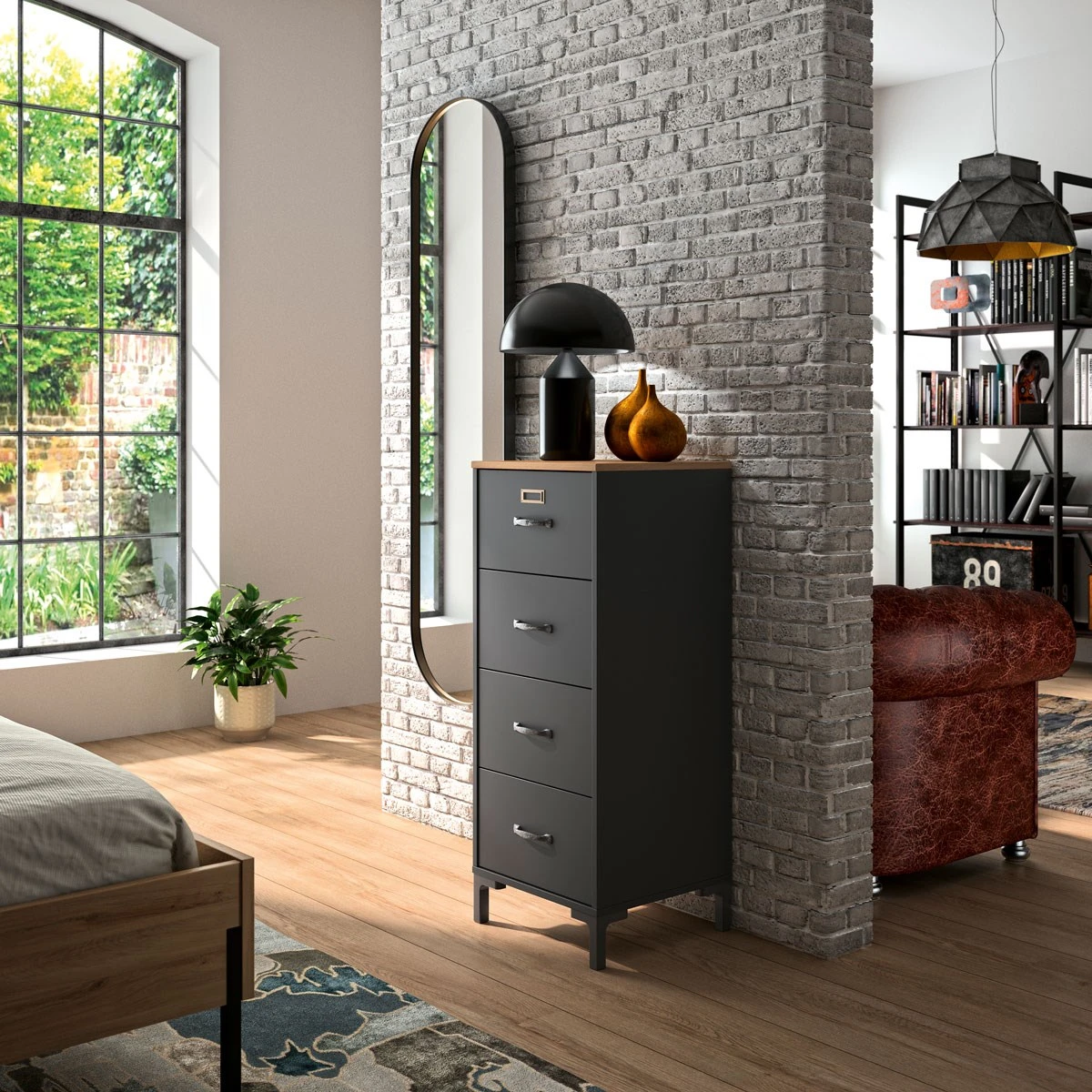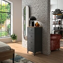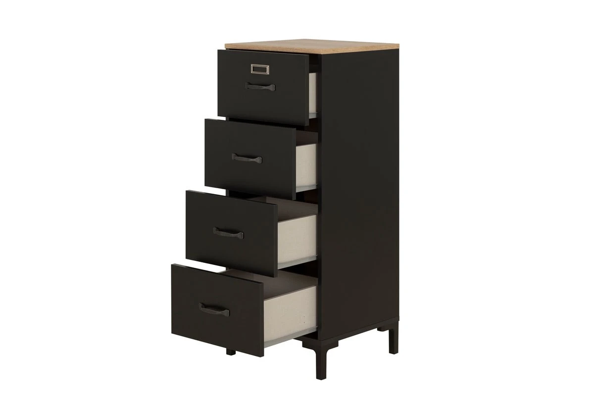 Deze commode behoort tot de industriële collectie MANCHESTER, tegenwoordig een trendy interieurstijl die jouw woonkamer extra pit geeft. Elk meubel binnen deze collectie is zorgvuldig gerealiseerd in decor imitatie eikenhout en zwart. Deze commode is voorzien van 4 ruime lades.