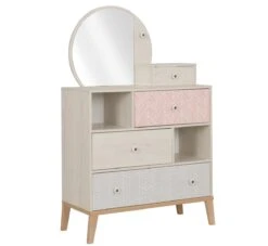 Deze commode ALIKA met leuke opzet voorzien van spiegel is gerealiseerd in gebleekt houtdecor met zacht gekleurde accenten. ALIKA brengt een gezellige sfeer in de kamer van jouw kleine spruit. De decoratieve print op de verschillende lades zorgt voor een speels karakter. De 3 lades en 2 open vakken zorgen voor voldoende opbergruimte. Combineer de commode met opzet ALIKA met andere meubels uit dezelfde serie.