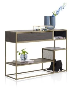 De wandtafel CITY met een industrieel karakter vormt een ware eyecatcher in je interieur. Ze is voorzien van 1 lade, 1 nis en 2 planken. Elk meubel uit de CITY reeks is zorgvuldig gerealiseerd in fineer eikenhout kleur Castle antraciet. De poten in goudkleurig metaal zorgen voor dat tikkeltje meer. Ook mogelijk in de kleur Railway brown met zwartkleurige poten.