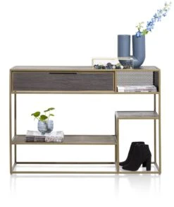 De wandtafel CITY met een industrieel karakter vormt een ware eyecatcher in je interieur. Ze is voorzien van 1 lade, 1 nis en 2 planken. Elk meubel uit de CITY reeks is zorgvuldig gerealiseerd in fineer eikenhout kleur Castle antraciet. De poten in goudkleurig metaal zorgen voor dat tikkeltje meer. Ook mogelijk in de kleur Railway brown met zwartkleurige poten.