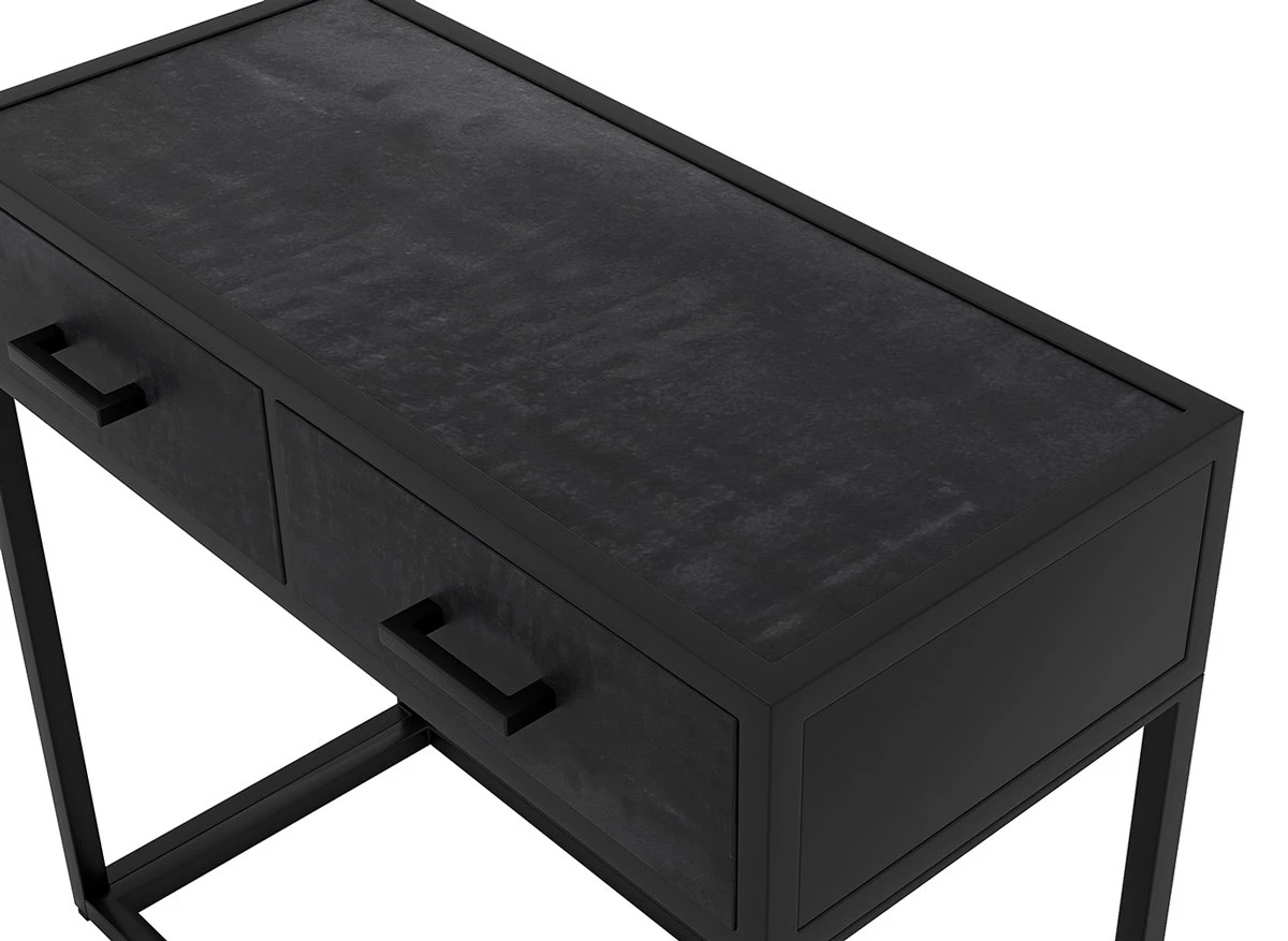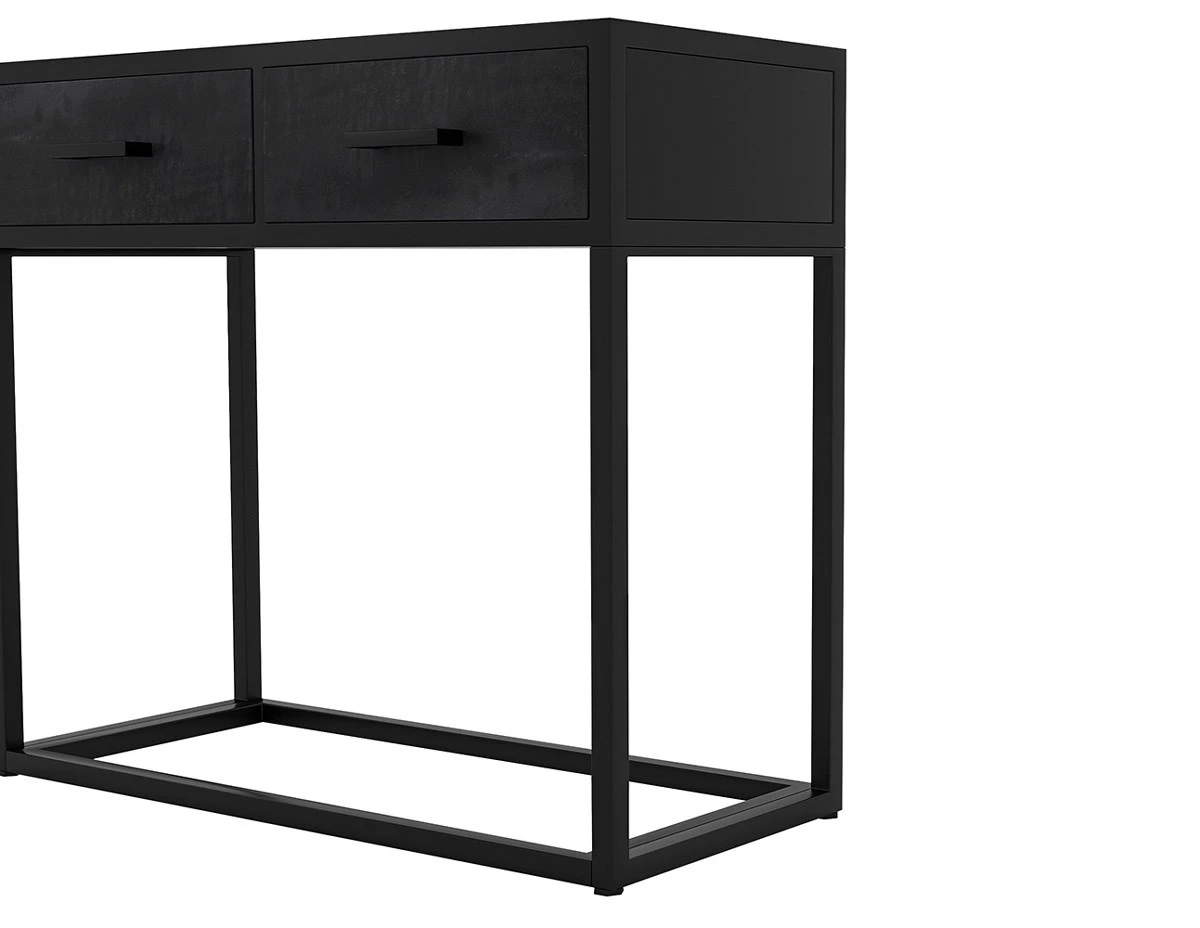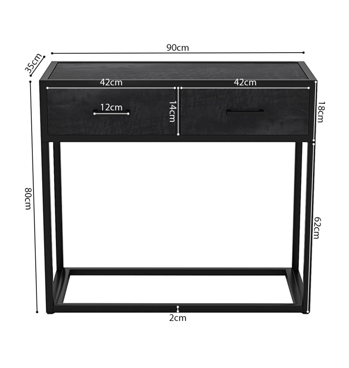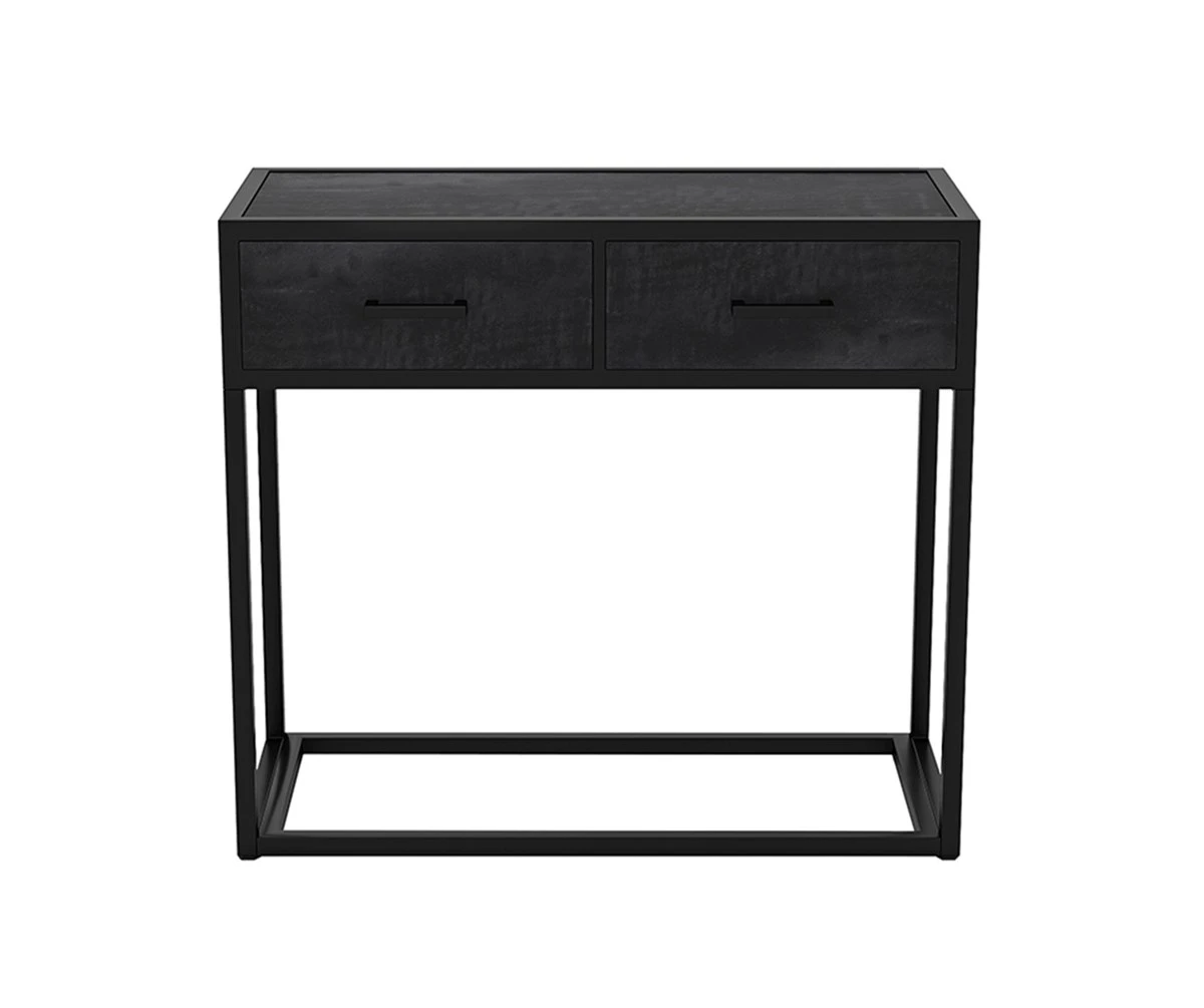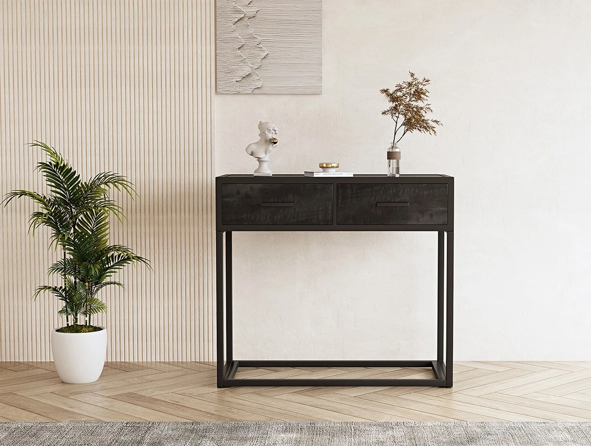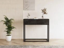 Leuke consoletafel MADEIRA gerealiseerd in houtdecor mangolia zwart. Deze console is voorzien van 2 praktische lades. Met zijn lengte van 90cm past deze hedendaagse console in elk interieur.