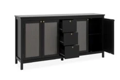 De dressoir CORDOBA in zwart met geweven decor is prachtig. Deze dressoir biedt veel opbergruimte dankzij de 4 deuren en 3 laden. Dit meubel is zeer stijlvol met zijn kleine gouden details en zal je verliefd maken.