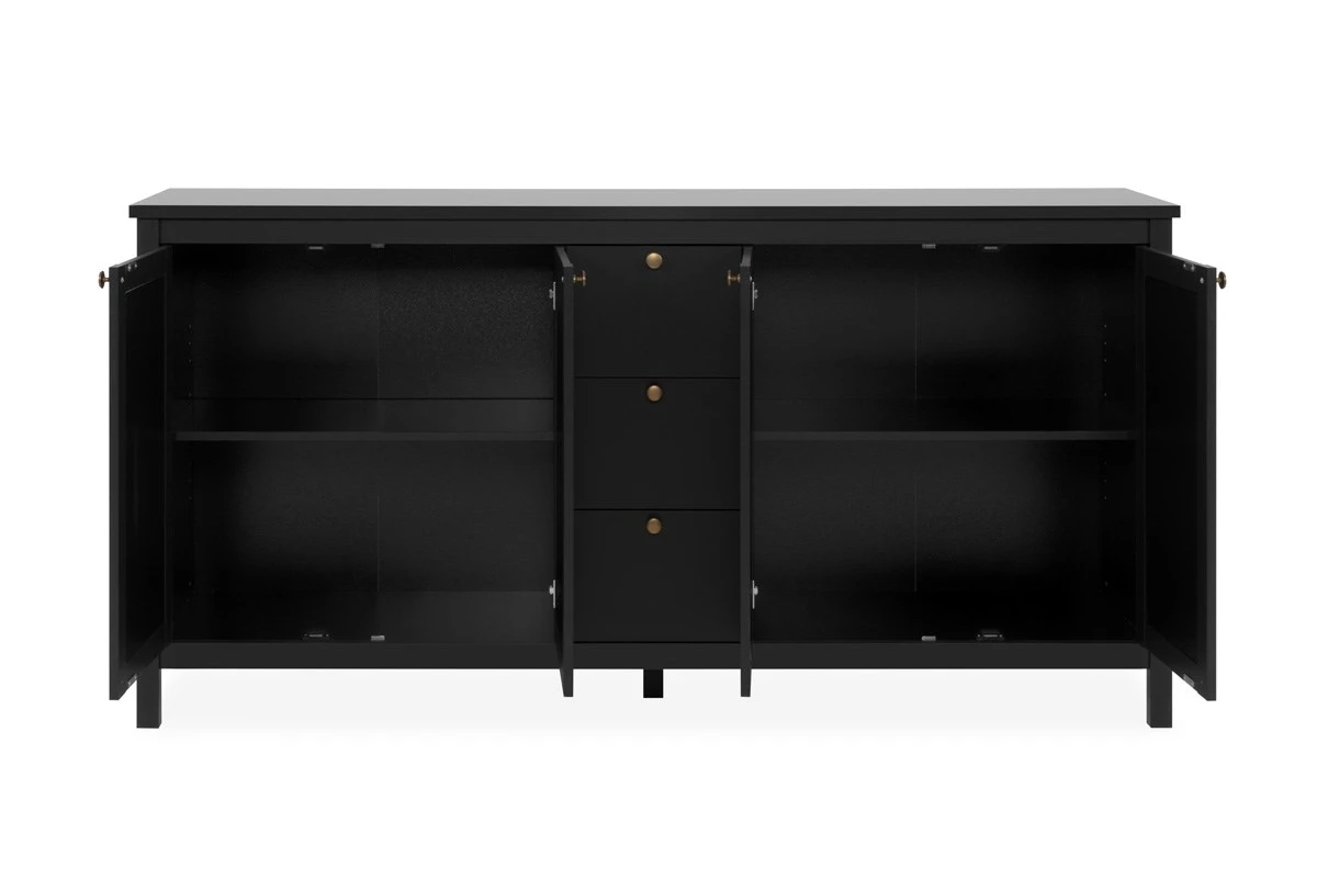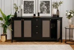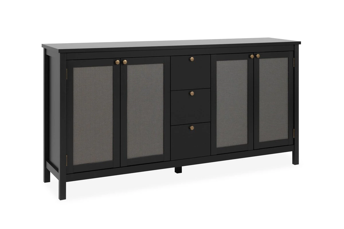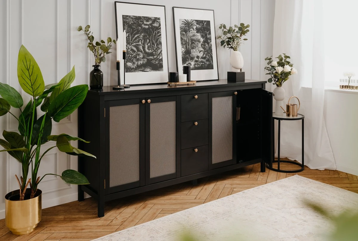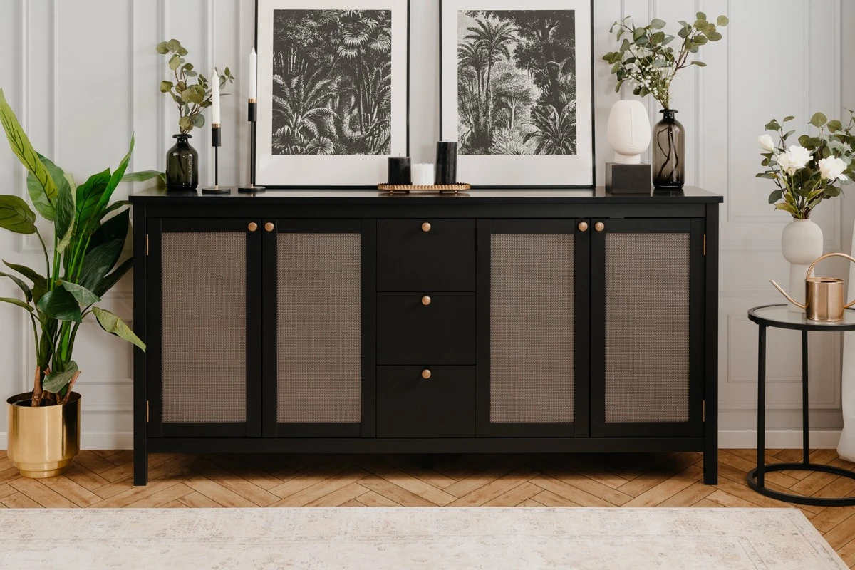 De dressoir CORDOBA in zwart met geweven decor is prachtig. Deze dressoir biedt veel opbergruimte dankzij de 4 deuren en 3 laden. Dit meubel is zeer stijlvol met zijn kleine gouden details en zal je verliefd maken.