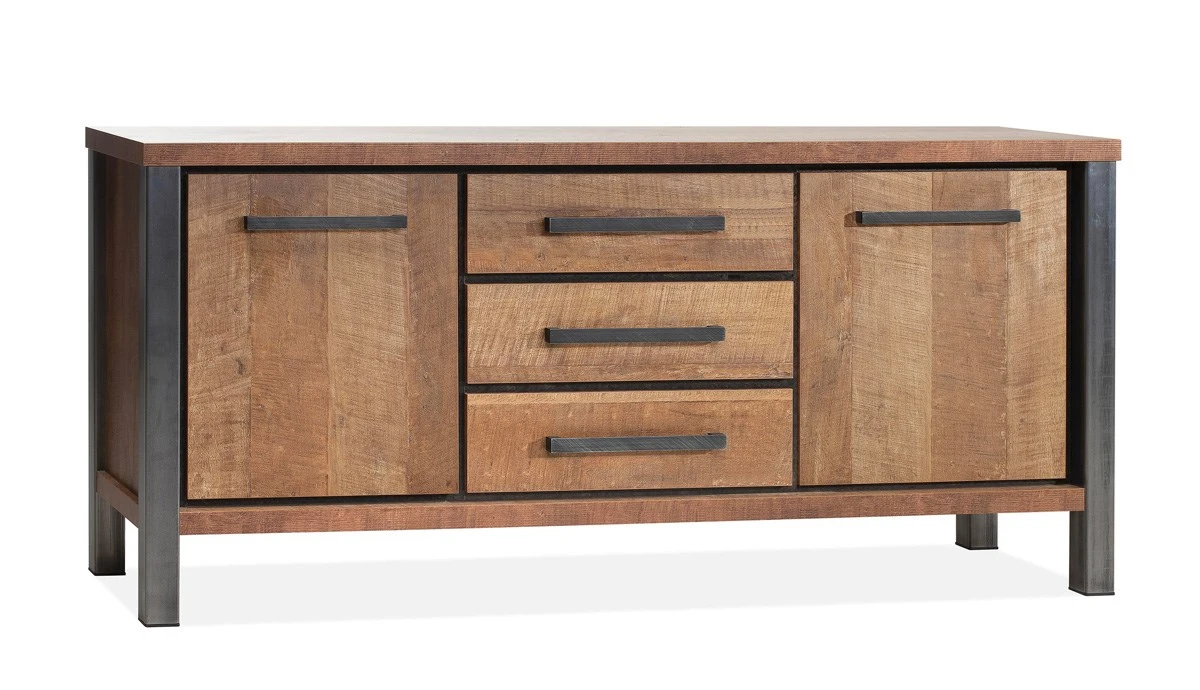 DeĀ dressoir KINGA in melamine Lamulux decor Old teak met eenĀ metallic afwerkingĀ isĀ prachtig. MetĀ z’n 2Ā deurenĀ en 3Ā ladesĀ biedtĀ deze dressoir je eenĀ enormeĀ opbergcapaciteit. DeĀ handgrepenĀ geven een eigentijdseĀ industriĆ«leĀ toets aan het geheel. Combineer de dressoir met andere meubelen uit deze serie.