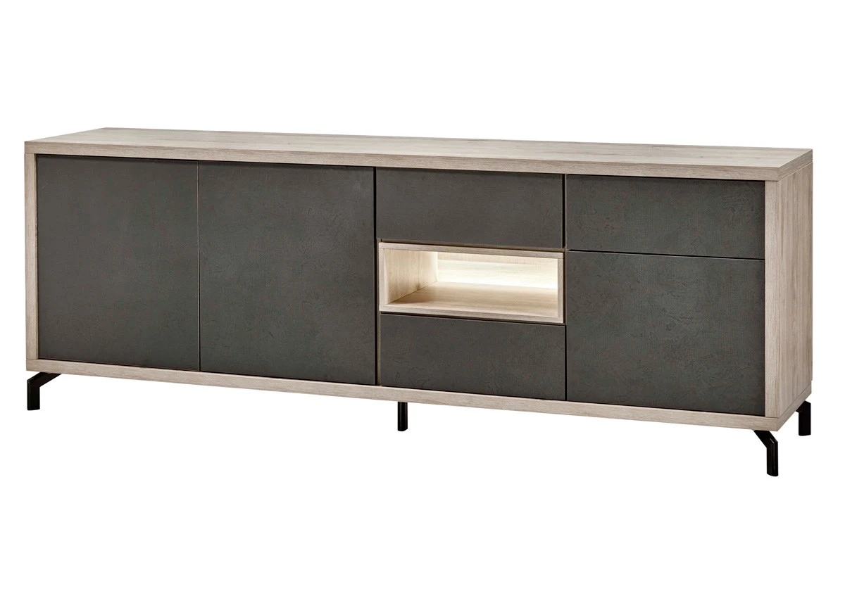 Praktische, ruime dressoir uit de collectie KWADRO. Deze prachtige woonkamer is gerealiseerd in melamine imitatie lichtgrijs eikenhout gecombineerd met antraciet kleur. Voor de meubelen KWADRO heb je keuze uit 4 verschillende afwerkingen (antraciet, beton, wit en zwart). Combineer deze dressoir met alle andere meubelen uit deze fantastische serie!