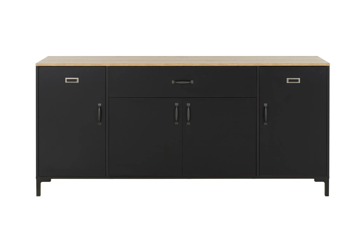 Deze dressoir behoort tot de industriële woonkamercollectie MANCHESTER, tegenwoordig een trendy interieurstijl die jouw woonkamer extra pit geeft. Elk meubel binnen deze collectie is zorgvuldig gerealiseerd in decor imitatie eikenhout en zwart. De dressoir is voorzien van 4 deuren en 1 lade.