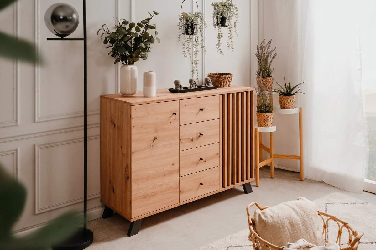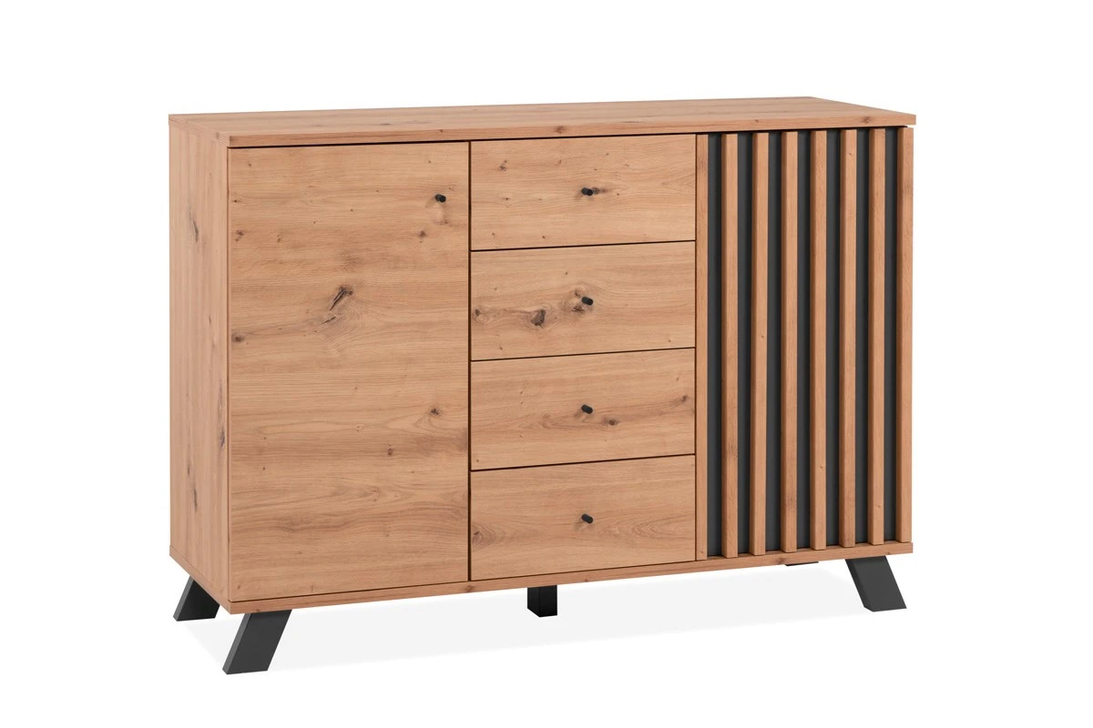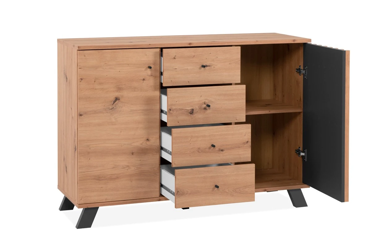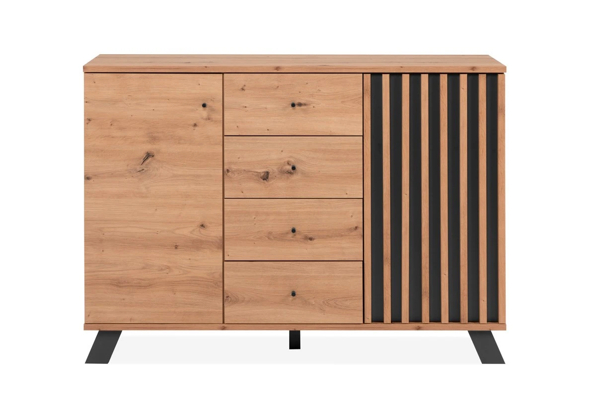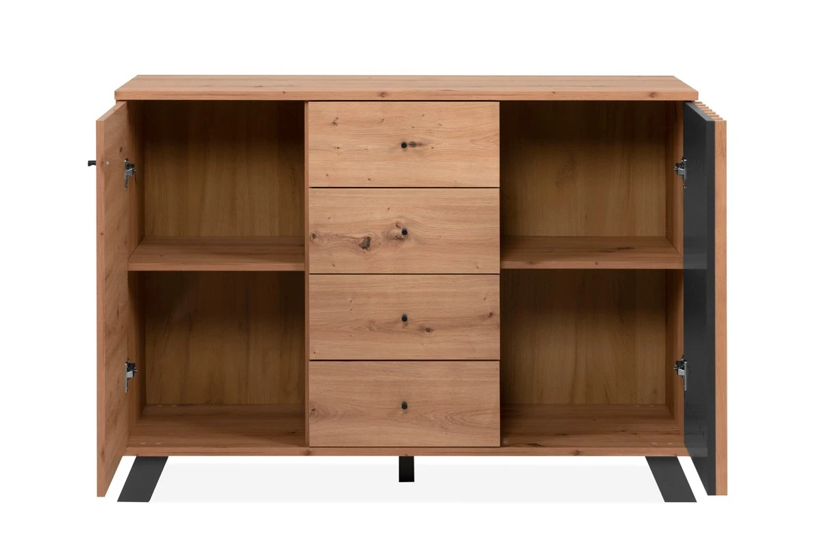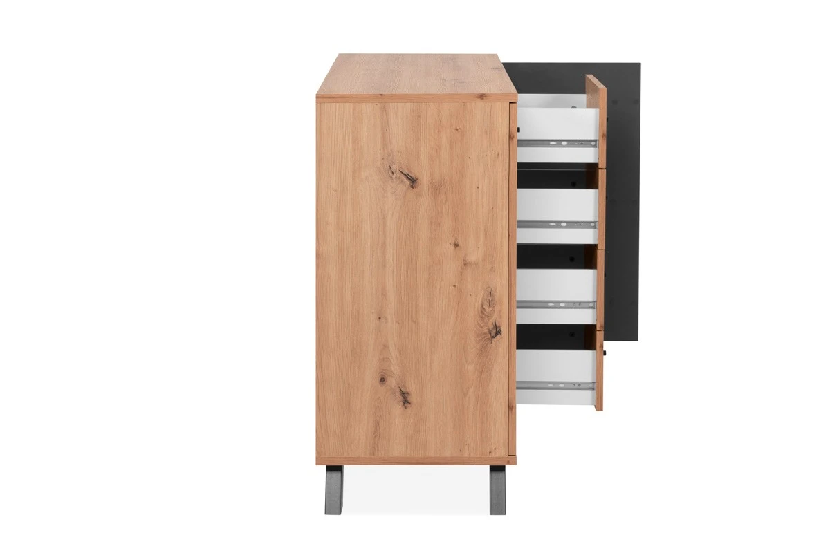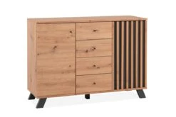 De dressoir MEDAN in artisan eiken decor is subliem! De houten strips op een antracietkleurige achtergrond vormen de originele toets van deze collectie. De dressoir heeft 2 deuren en 4 laden om jouw dagelijkse spullen op te bergen. Hij zal geweldig staan in een modern interieur.