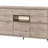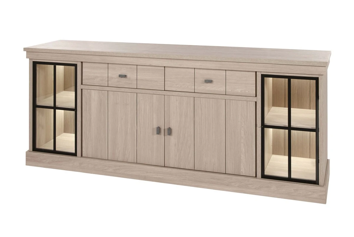 De dressoir 216 cm ORANGE is gerealiseerd in melamine imitatie hout olm kleur en is voorzien van een sfeervolle verlichting. De zwarte details geven het geheel een stijlvolle toets.