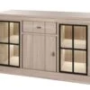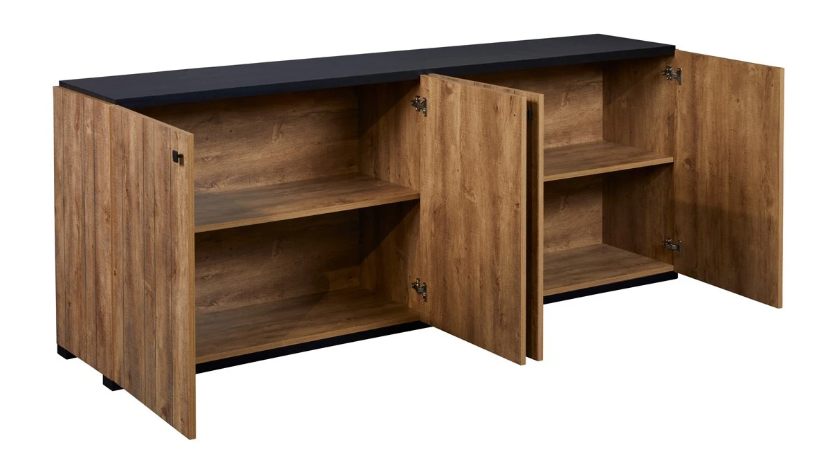 Deze stijlvolle dressoir behoort tot de prachtige woonkamer SHARON met meubelen gerealiseerd in denver oak. Z’n bruine, natuurlijke kleur zorgt voor een warme sfeer in je interieur. De combinatie van dit mooie houtdecor met het zwart van het bovenblad en de handvaten zorgt voor extra dynamiek. Combineer de 4-deurs dressoir SHARON met andere meubelen uit deze reeks.