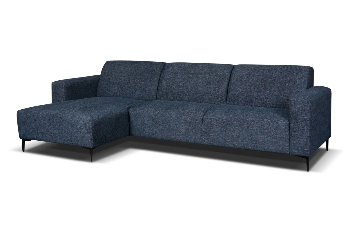 De hoekzetel LAGUNA in jeansblauwe stof kenmerkt zich door een ongekend zitcomfort. Het design is simpel en mooi, met als extra toevoeging de stijlvolle zwart metalen poten.