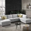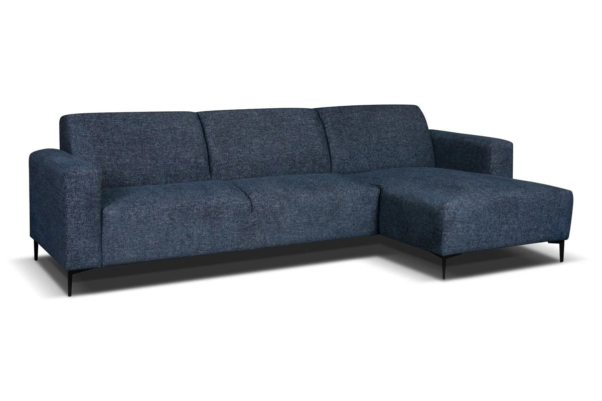 De hoekzetel LAGUNA in jeansblauwe stof kenmerkt zich door een ongekend zitcomfort. Het design is simpel en mooi, met als extra toevoeging de stijlvolle zwart metalen poten.