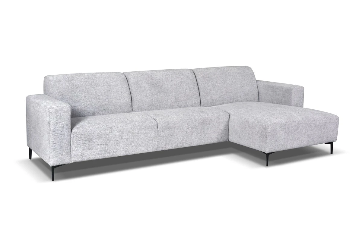 De hoekzetel LAGUNA in lichtgrijze stof kenmerkt zich door een ongekend zitcomfort. Het design is simpel en mooi, met als extra toevoeging de stijlvolle zwart metalen poten.