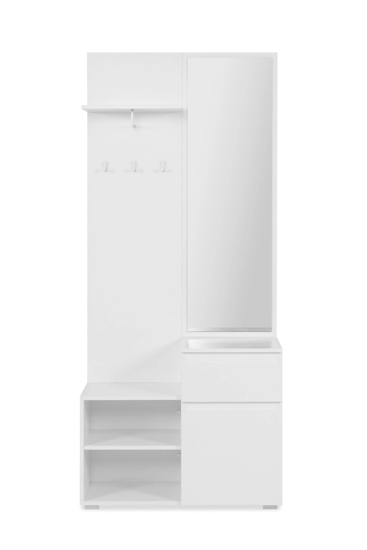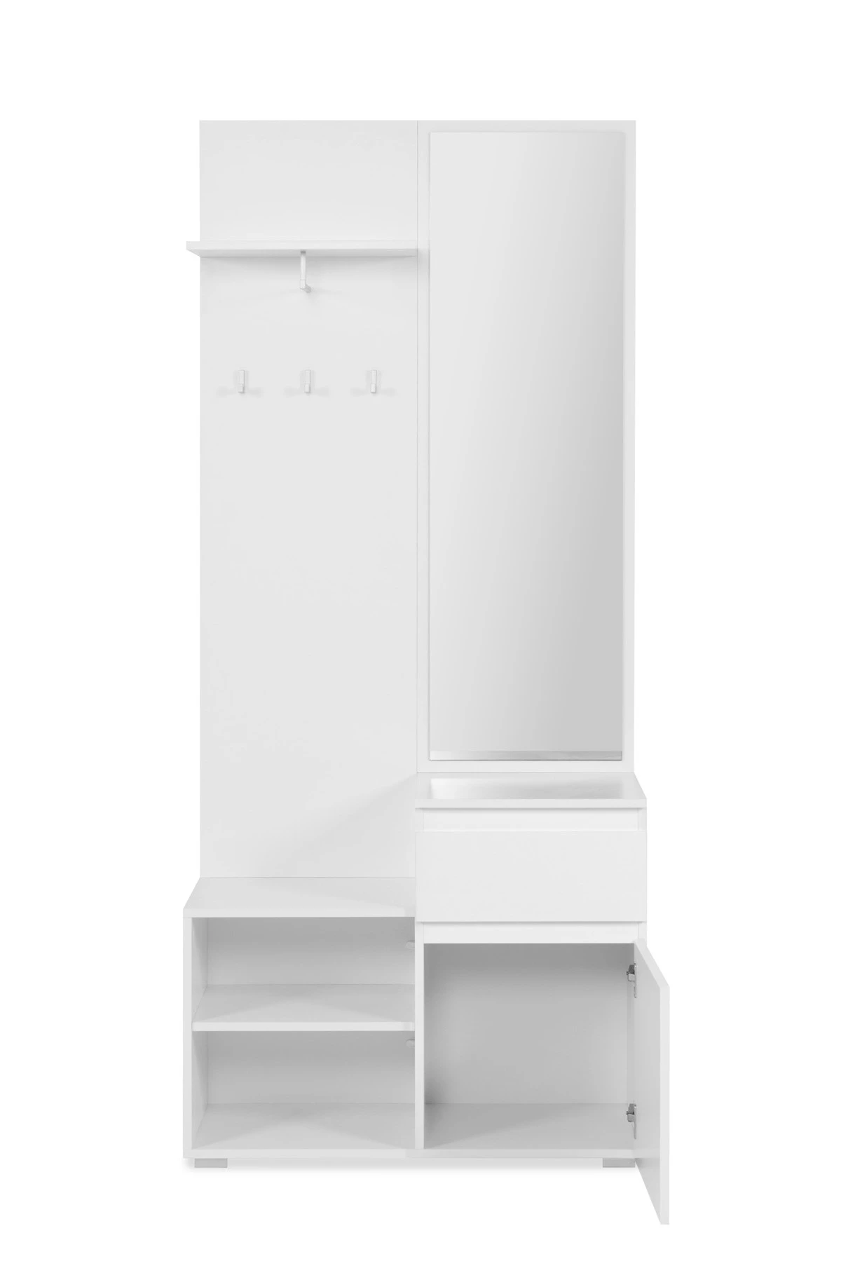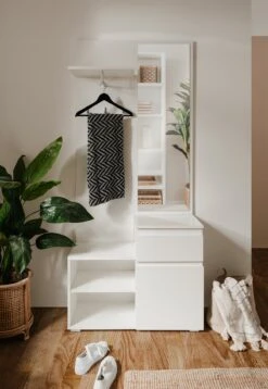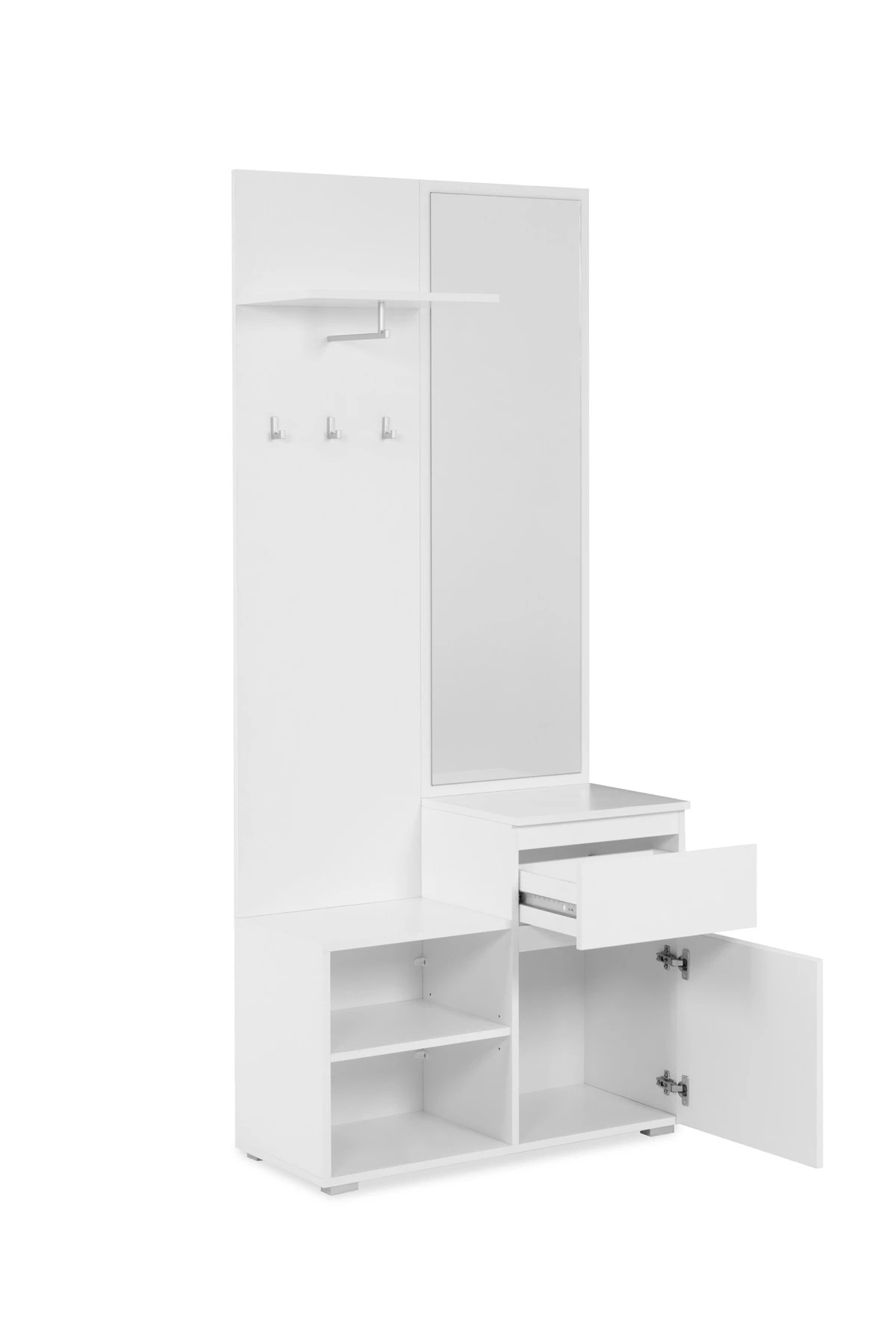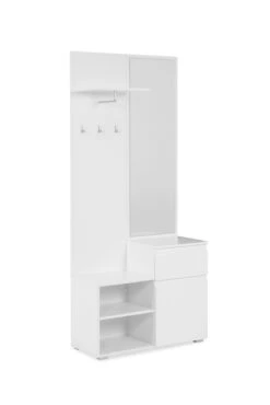 Deze inkomkast maakt deel uit van de IMAGE collectie. Hij is gemaakt in wit decor. De ingang heeft 1 deur, 1 lade, 2 nissen, 1 plank, 1 spiegel, 1 hangstang en 3 haken. In al deze elementen kun je al jouw dagelijkse voorwerpen kwijt. De inkomkast MAGE 41B biedt veel opbergruimte voor je jassen, schoenen en accessoires.