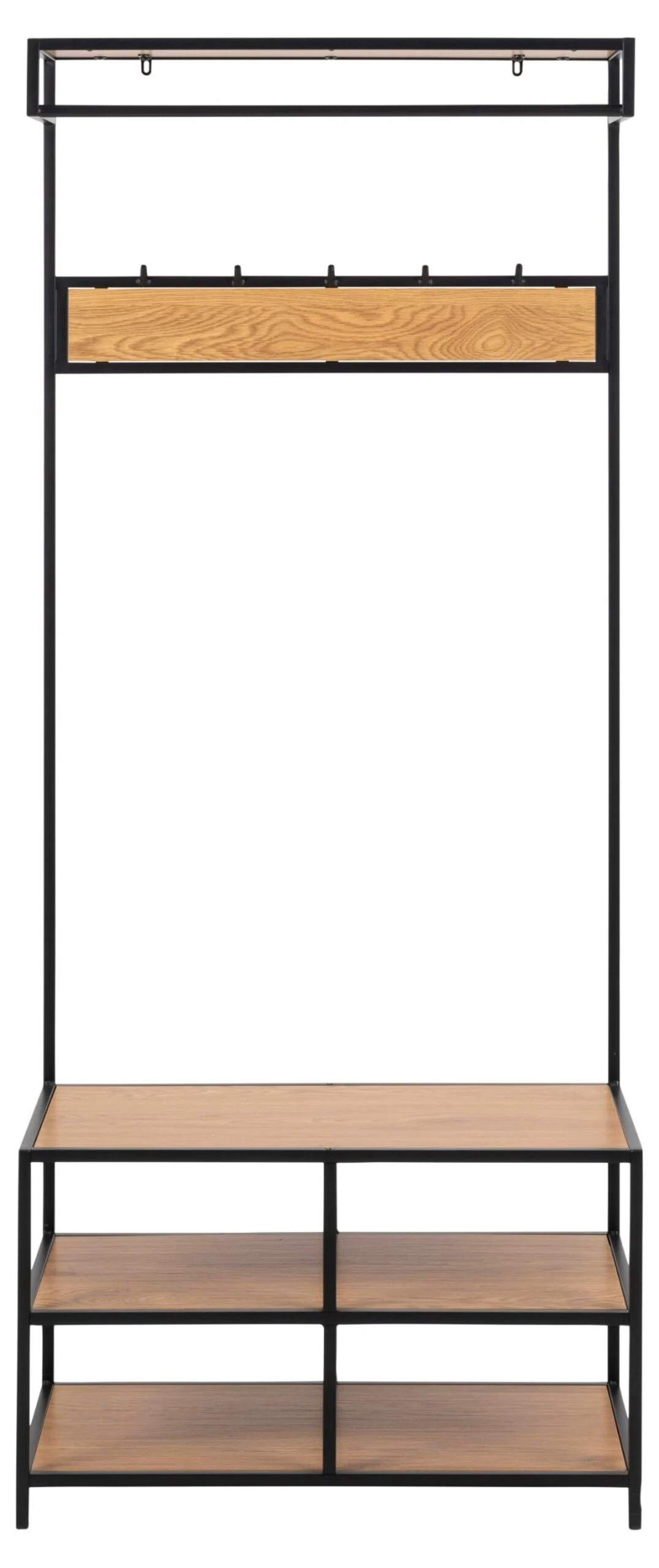 Deze inkomkast maakt deel uit van de SEAFORD collectie. Hij is gemaakt van wild eiken decor en mat zwart metaal. De gangkast heeft 4 legplanken en 5 haken. Combineer de hal unit met de andere units in de collectie.