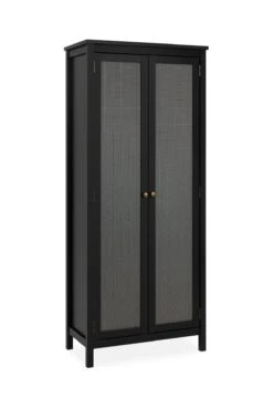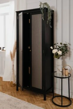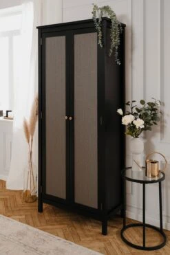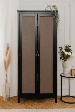 De kleerkast CORDOBA in zwart met geweven decor is prachtig. Dit meubel biedt veel opbergruimte dankzij de 2 deuren. Deze kast is zeer stijlvol met zijn kleine gouden details en zal je verliefd maken.