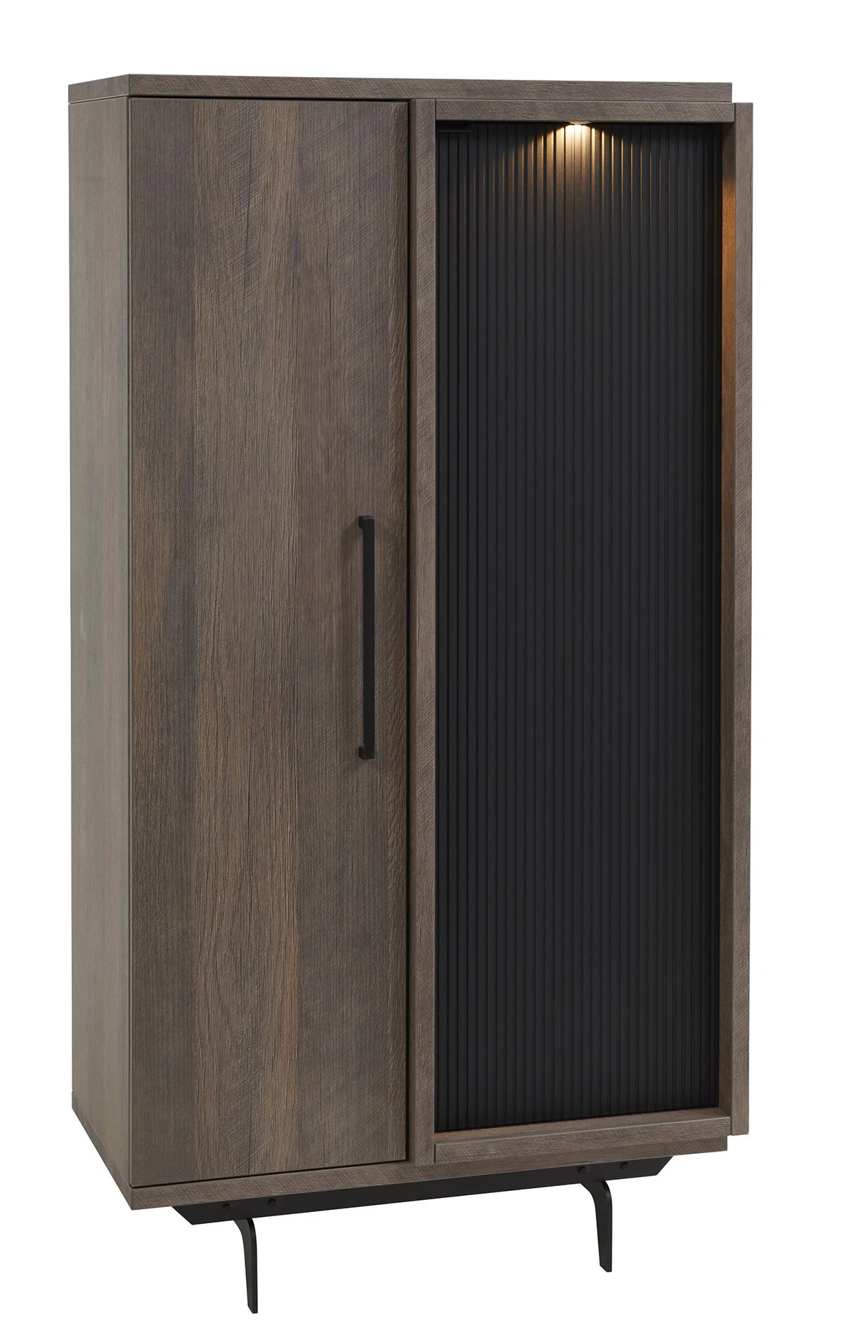 De prachtige kolomkast bar TRENTINO 88cm heeft 2 deuren. Met zijn kleur golden oak en matzwarte details, past hij makkelijk in elk modern interieur.