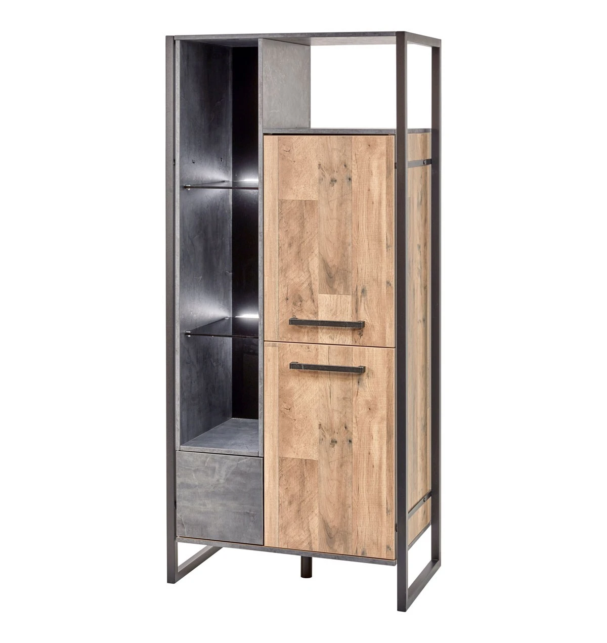 Een kolomkast bar die zowel sober als elegant is dankzij de eigentijdse industriële stijl. Hij heeft 2 houten deuren en veel planken. De collectie SAMIR combineert hout en staal om karakter te geven aan jouw interieur.