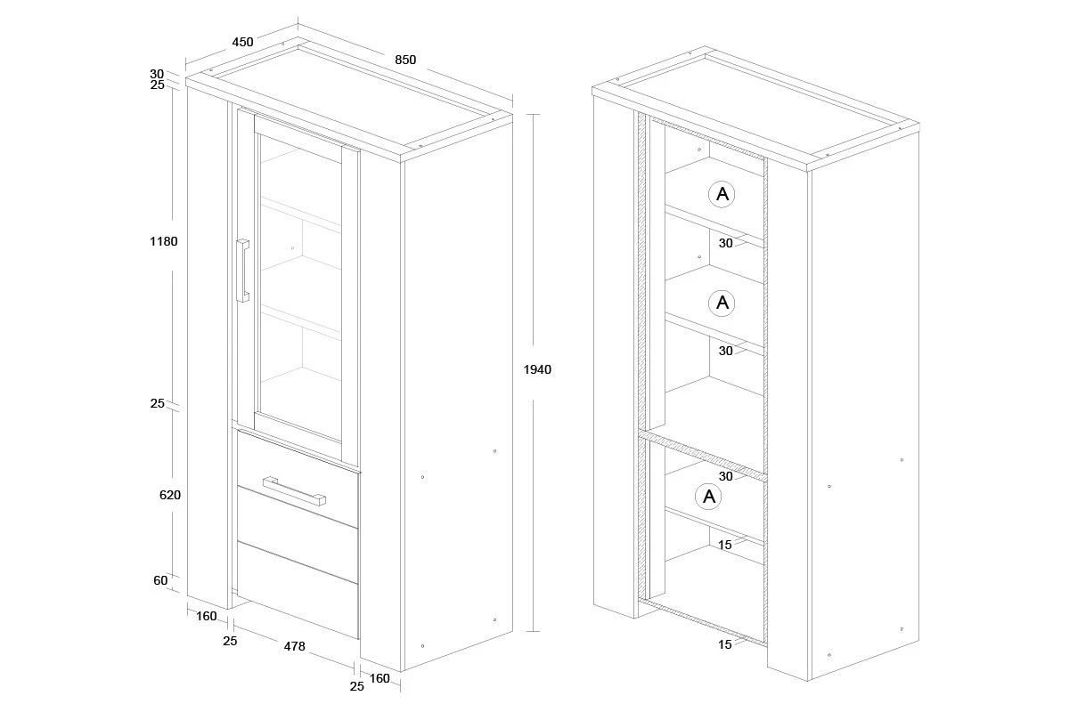 Deze kolomkast is gerealiseerd in imitatie hout en behoort tot de woonkamercollectie ELITE. Combineer de vitrine Elite met andere meubelen uit dezelfde reeks.