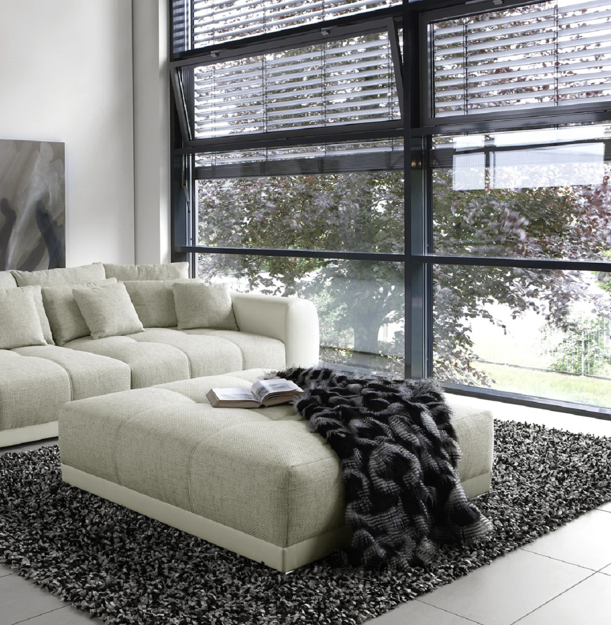 Deze poef in stof en Pu is perfect om te zitten of je voeten op te zetten