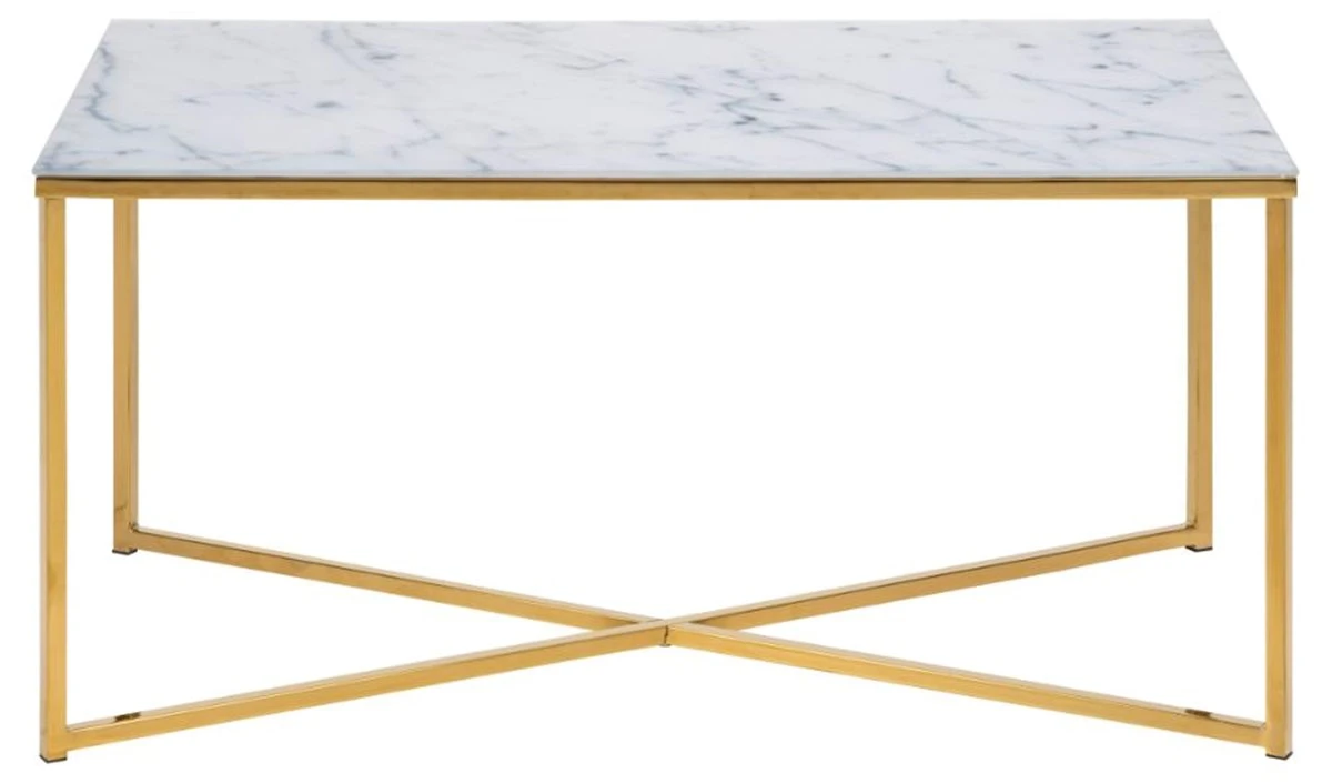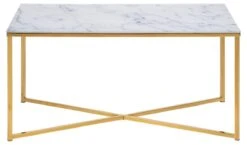 De ALISMA tafel is erg trendy met zijn gouden metalen onderstel en zijn mat wit marmer-look tafelblad.