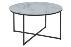 Maak kennis met deze prachtige ronde salontafel ALISMA 86238! De ronde vorm van deze salontafel met een wit marmeren look biedt royale ruimte voor je tijdschriften en koffie. Het gekruiste zwarte metalen onderstel fungeert als een ondersteunend frame dat het glazen tafelblad vasthoudt. De zorgvuldig geselecteerde materialen zijn gemakkelijk te onderhouden.