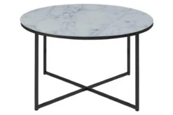 Maak kennis met deze prachtige ronde salontafel ALISMA 86238! De ronde vorm van deze salontafel met een wit marmeren look biedt royale ruimte voor je tijdschriften en koffie. Het gekruiste zwarte metalen onderstel fungeert als een ondersteunend frame dat het glazen tafelblad vasthoudt. De zorgvuldig geselecteerde materialen zijn gemakkelijk te onderhouden.