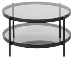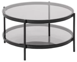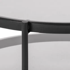De salontafel BAYONNE heeft een matte basis in zwart en de tafelbladen zijn gemaakt van glas. De vorm van de salontafel is rond.