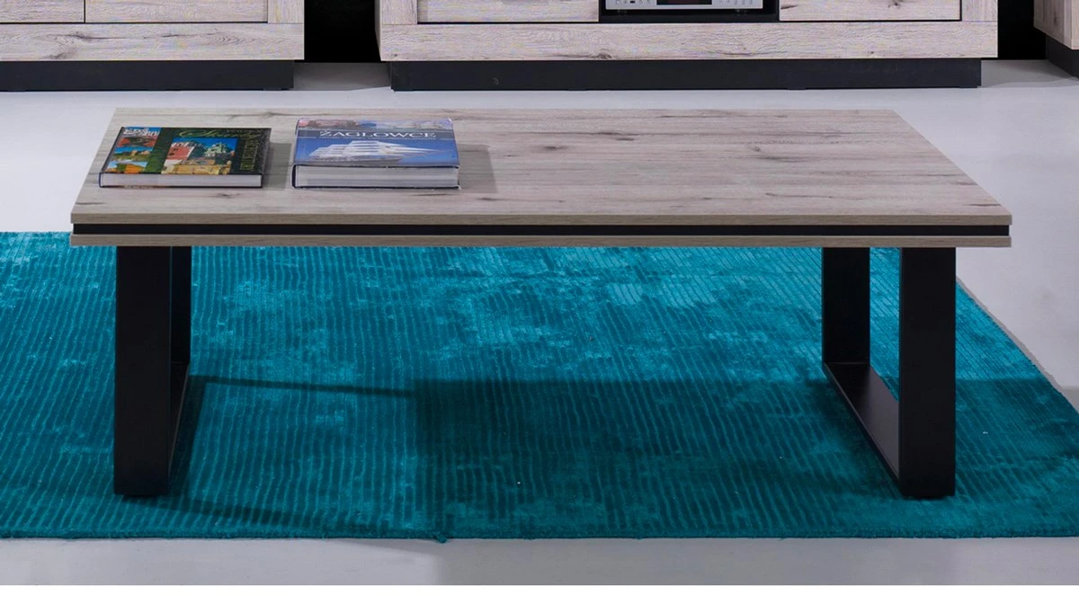 De salontafel is gerealiseerd in wellington eik decor. Ze heeft U-poten.