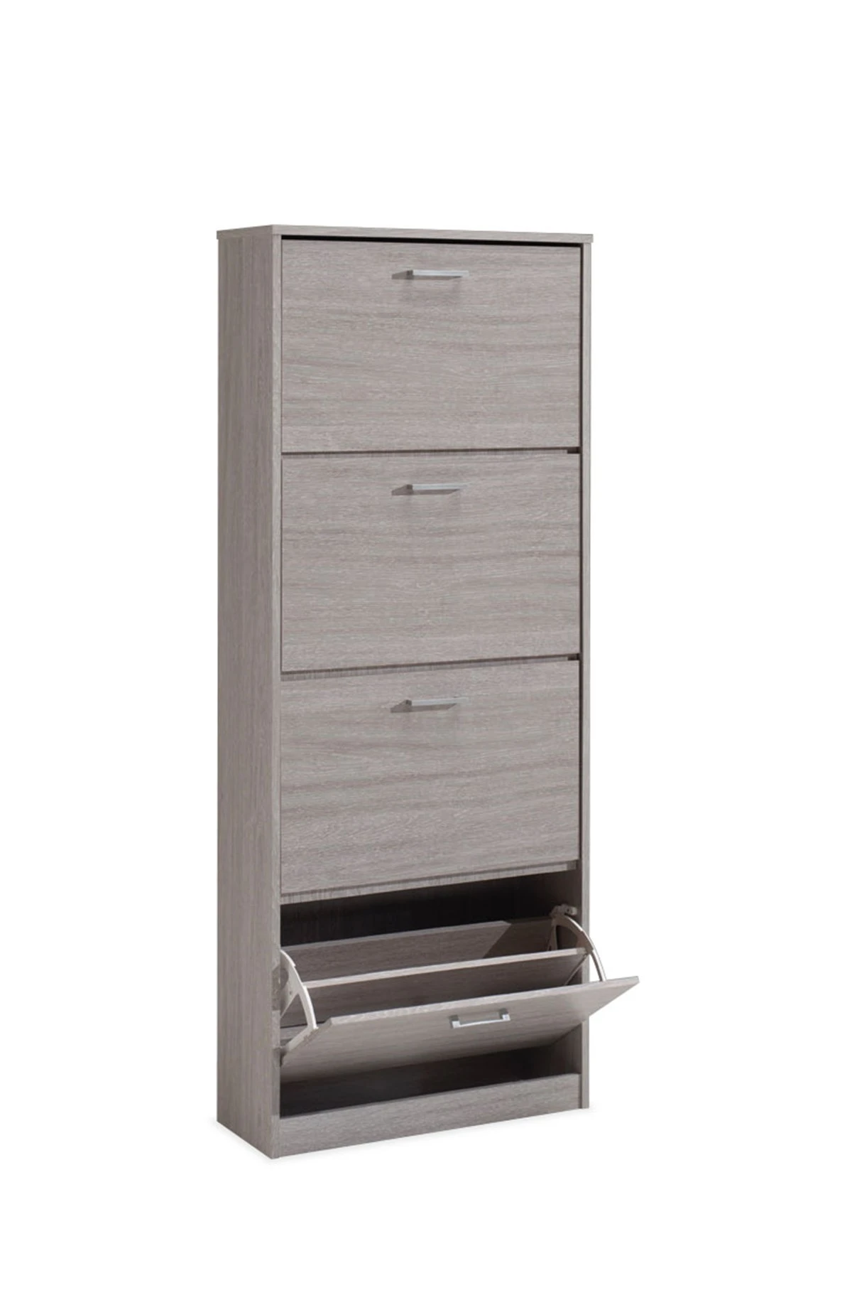 De schoenenkast CARINI 5203-5 heeft 4 lades en is gerealiseerd in decor grijze eik. Het is een praktisch opbergmeubel voor jouw schoenen. Mogelijk in verschillende kleuren.