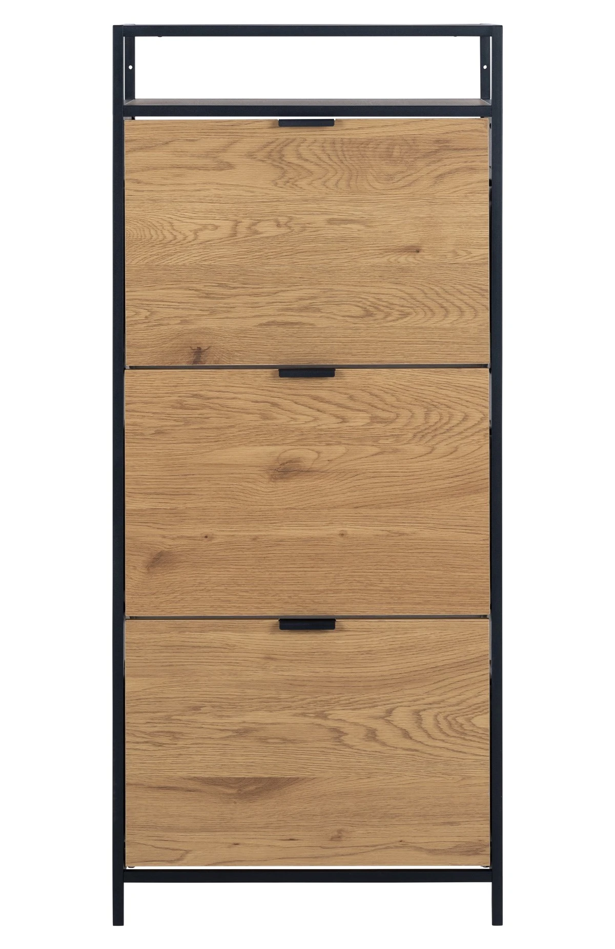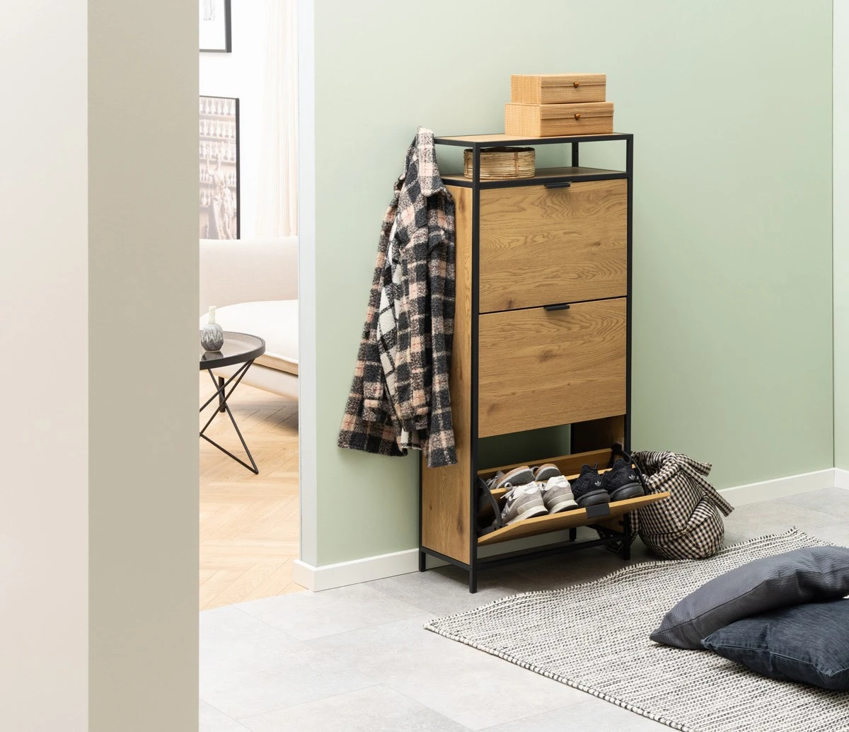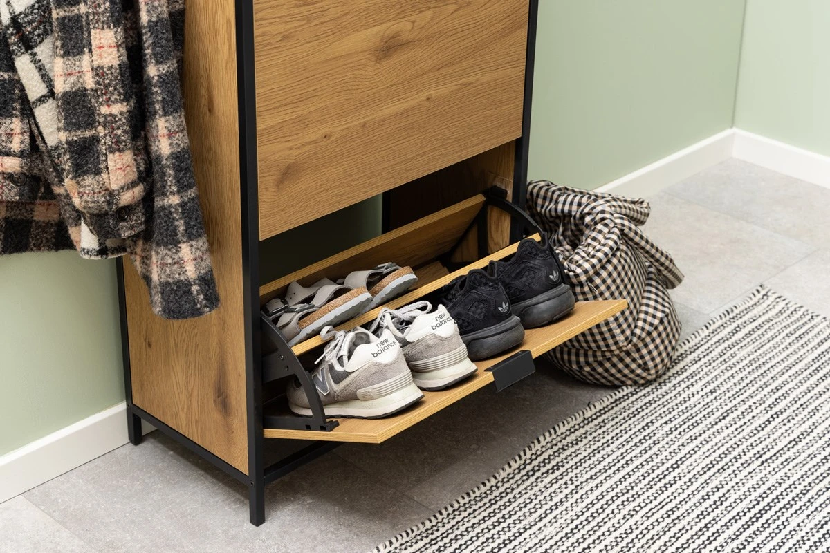 Heb je extra vloerruimte nodig in je gang? Dan is deze schoenenkast SEAFORD ideaal! Hij zorgt ervoor dat je schoenen een thuis hebben. Houd je schoenen bij elkaar in de twee rijen die elke lade bevat – en met drie lades heb je meer dan genoeg ruimte. De wilde eiken look in combinatie met het zwarte metalen frame zal een moderne toevoeging zijn aan elk huis.