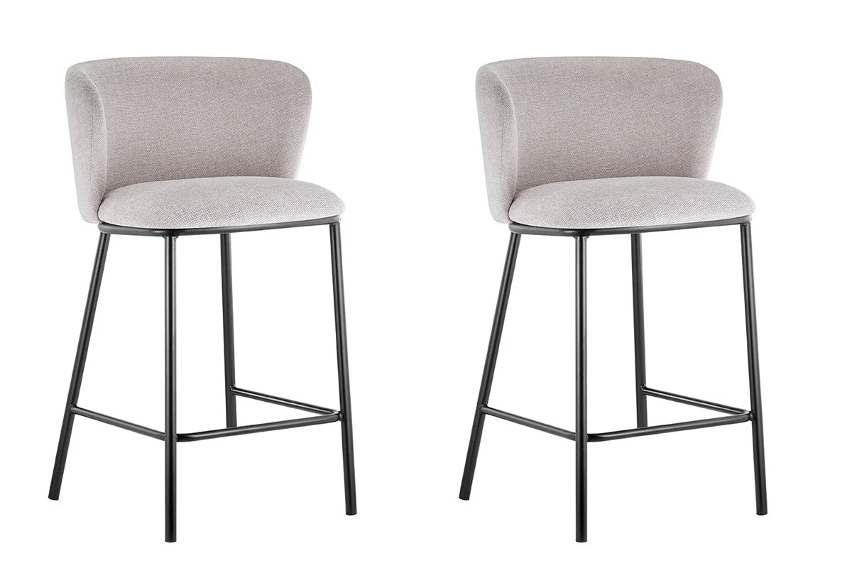 Aantrekkelijke set van 2 barstoelen ARTHUR in stof kleur Beige. Met afgeronde rug en 4 zwarte metalen poten, voor een elegante, tijdloze stijl.