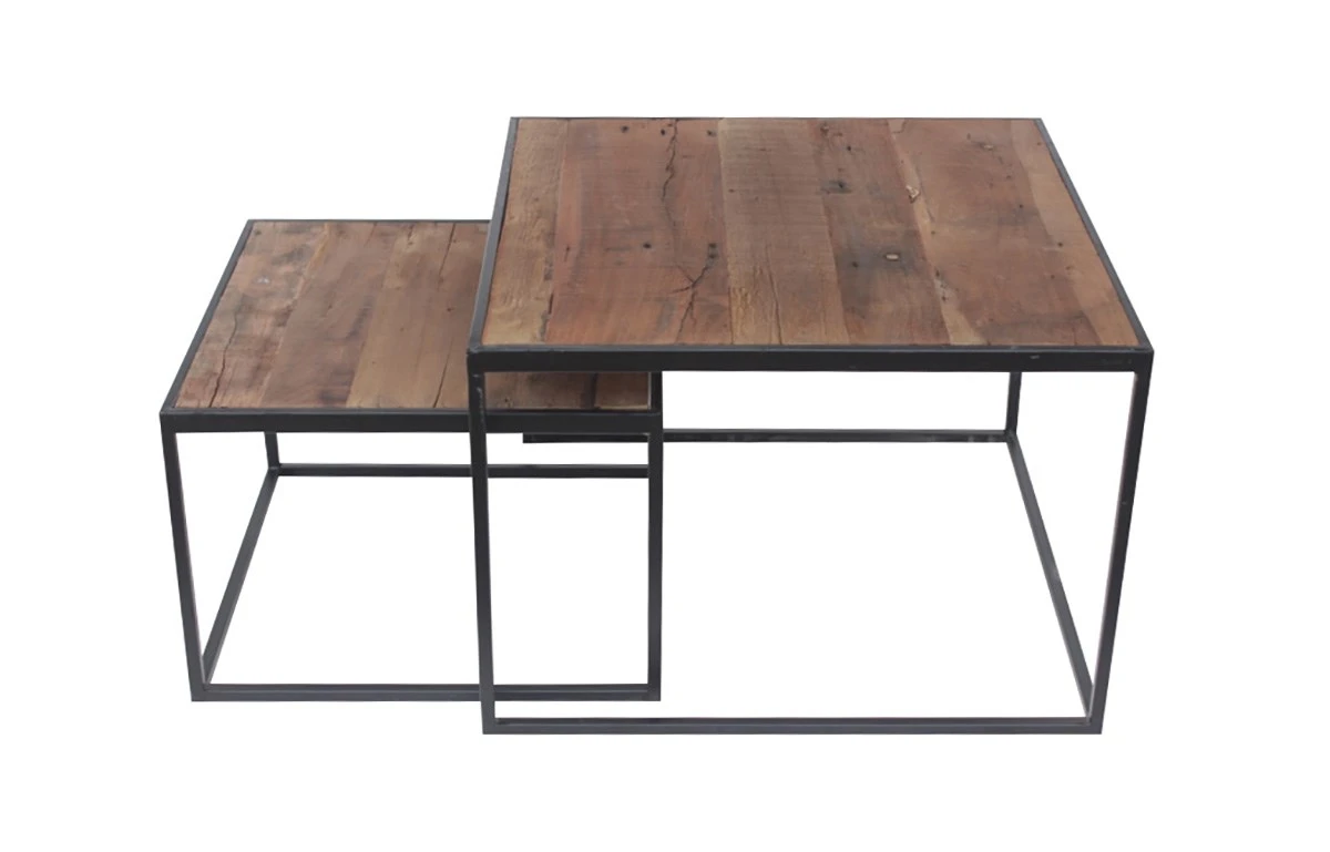 Deze set van 2 bijzettafels QUINN met tafelblad in gerecycleerd hout en zwart metalen poten is ideaal om je mooiste decoratie op te plaatsen of om als salontafel te gebruiken. Handig, niet?