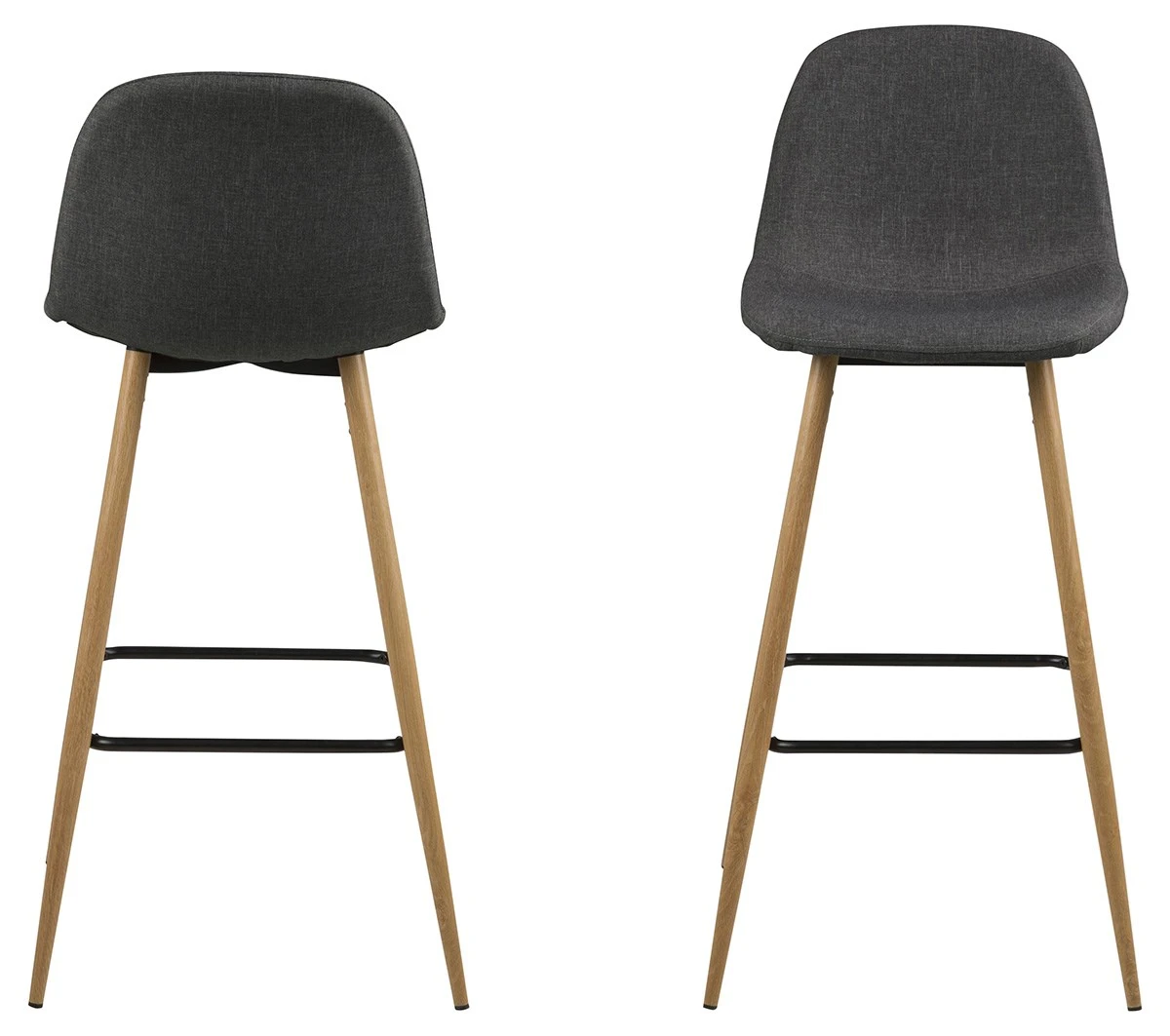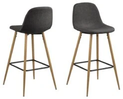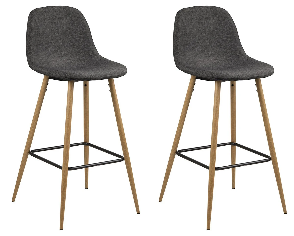 Deze set van 2 hoge barstoelen met hoogte 101cm WILMA 16977 in kleur grijs combineert comfort en elegantie dankzij z’n stoffen zitting en eikenhouten poten. Mogelijk in meerdere kleuren.