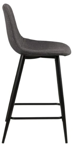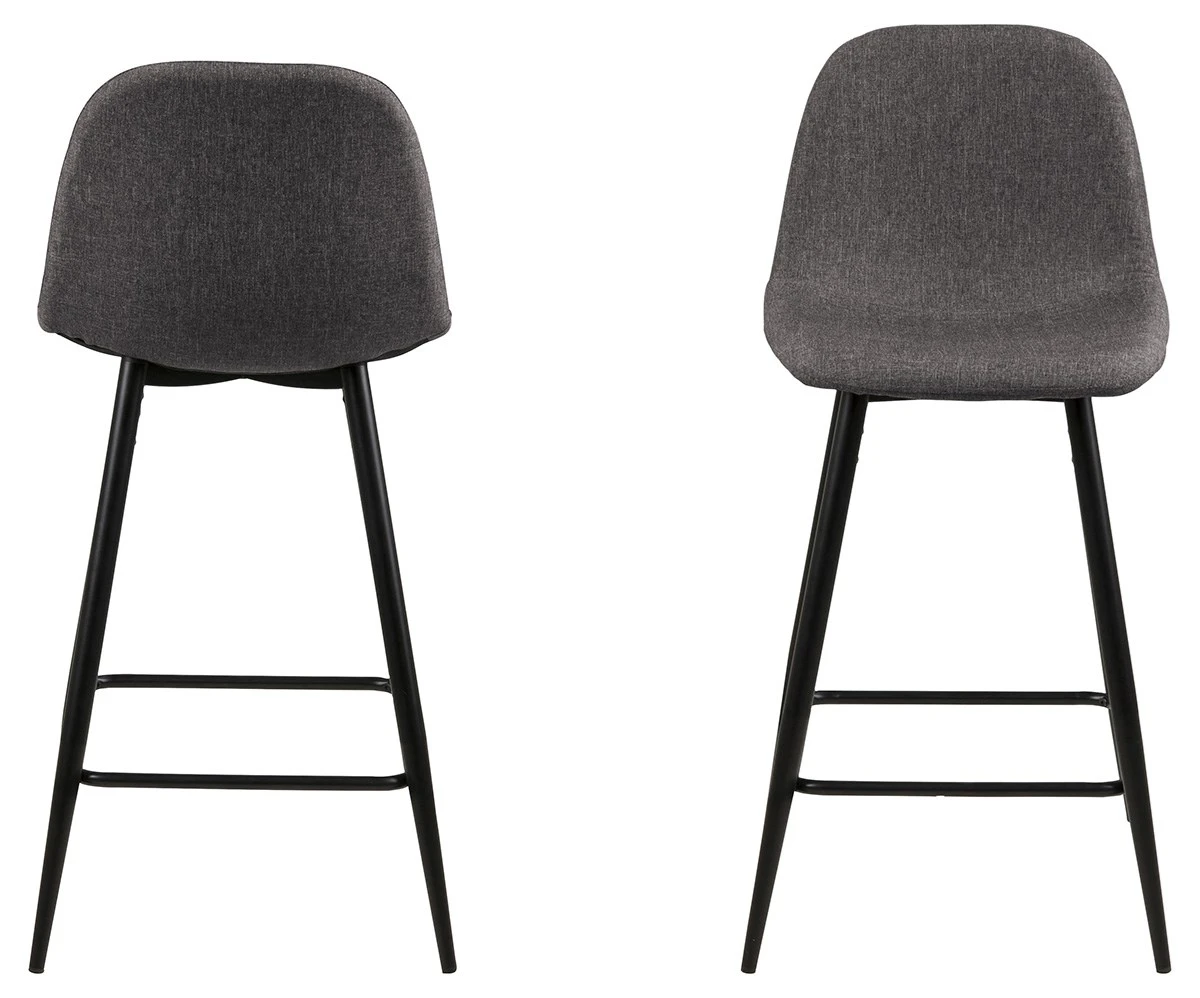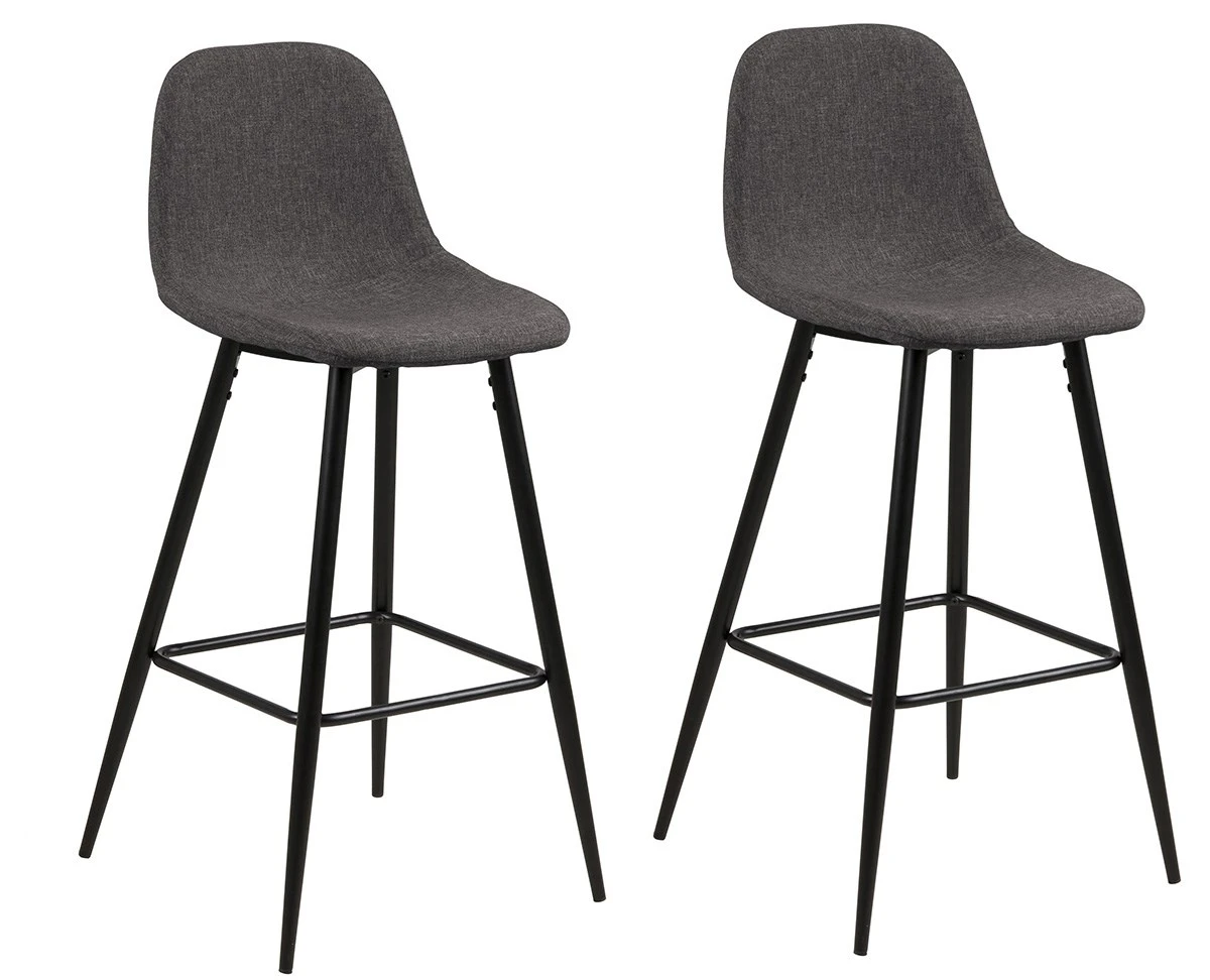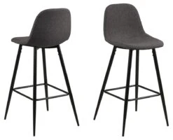 deze set van 2 lage barstoelen met hoogte 91cm WILMA 16693 in kleur grijs 5 combineert comfort dankzij zijn stoffen zitten en elegantie dankzij de zwart metalen poten. Verkrijgbaar in verschillende kleuren. Verkocht per set van 2 stoelen.