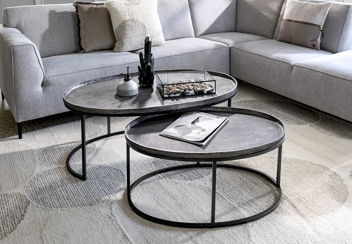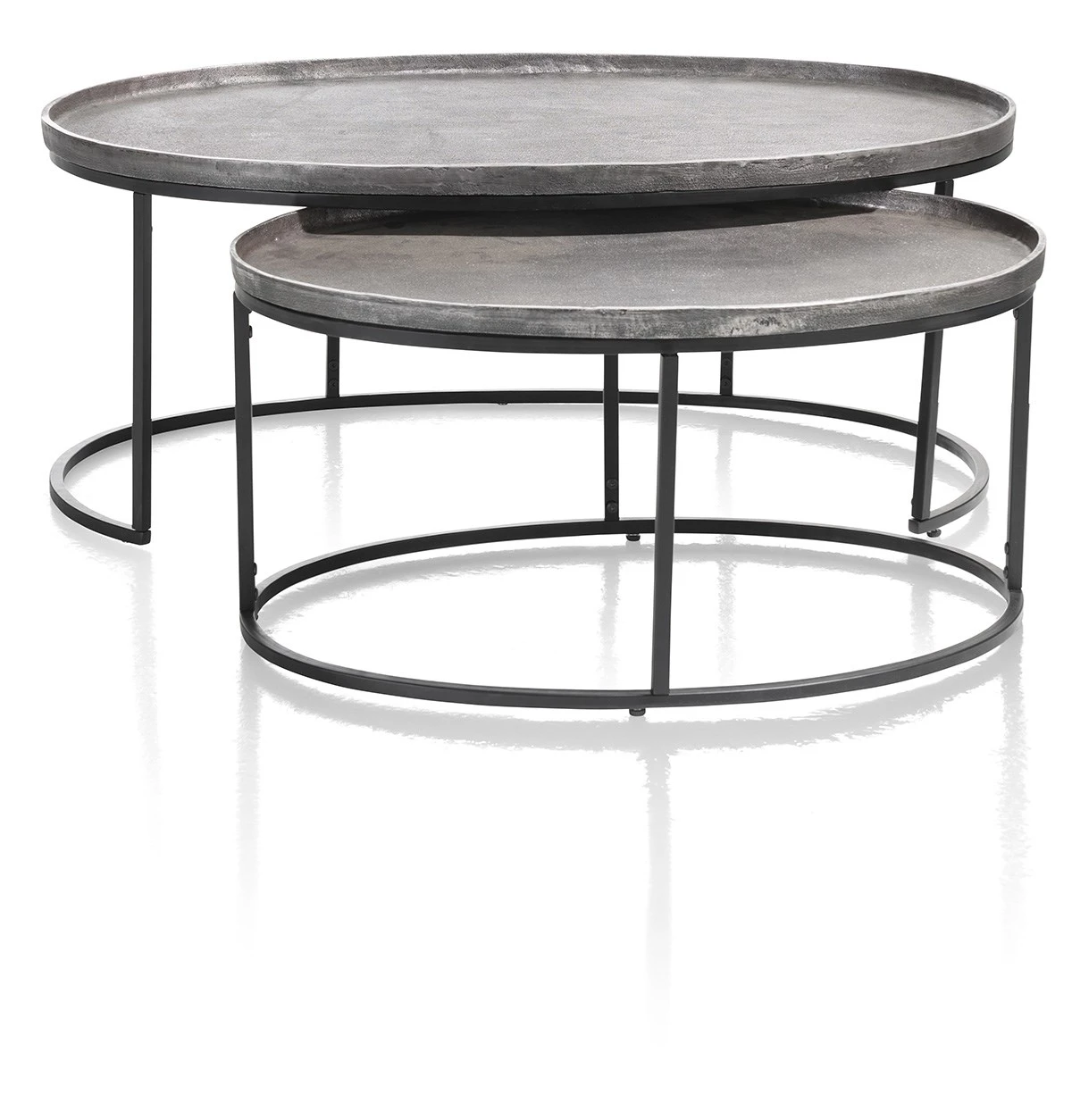 Prachtige set van 2 BELFAST salontafels met verouderd metalen blad en zwarte metalen poot, voor een rauw industrieel effect!