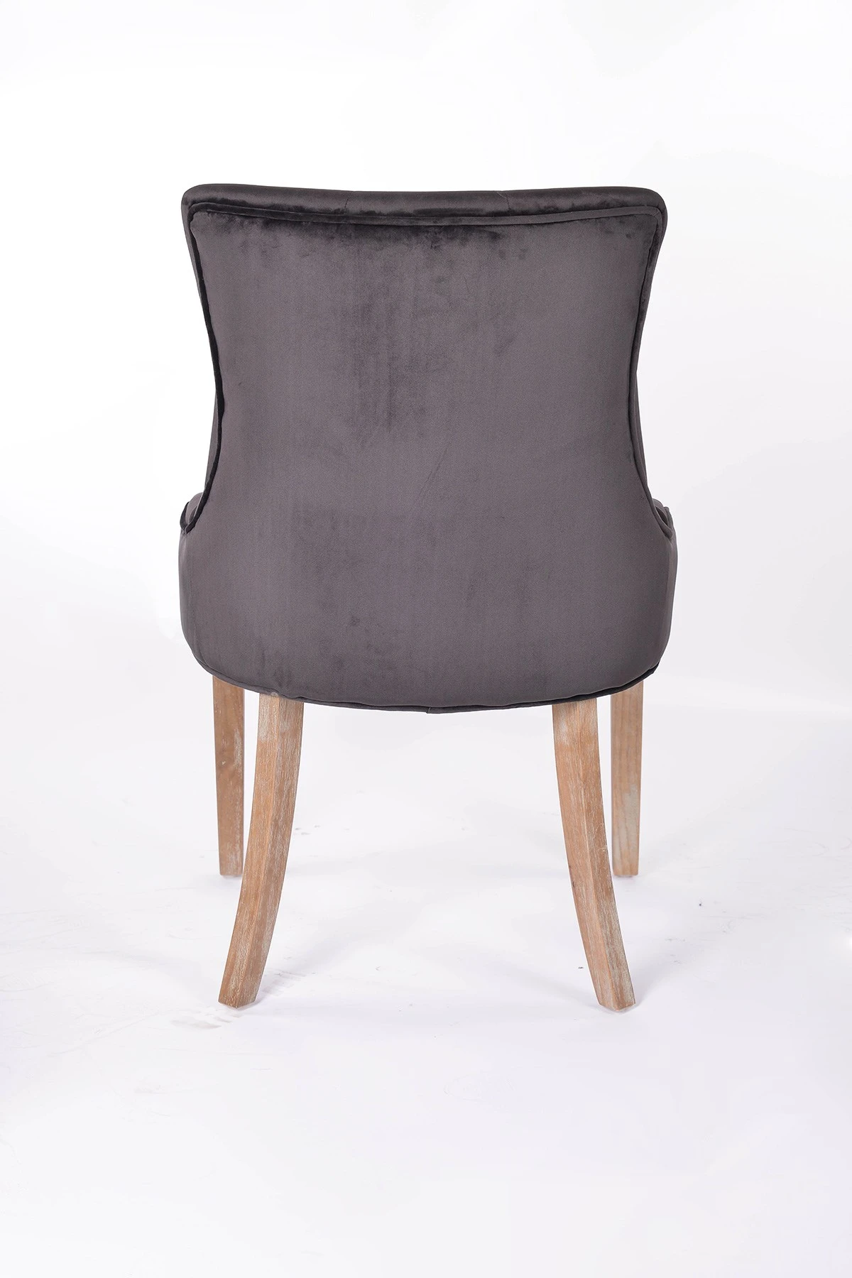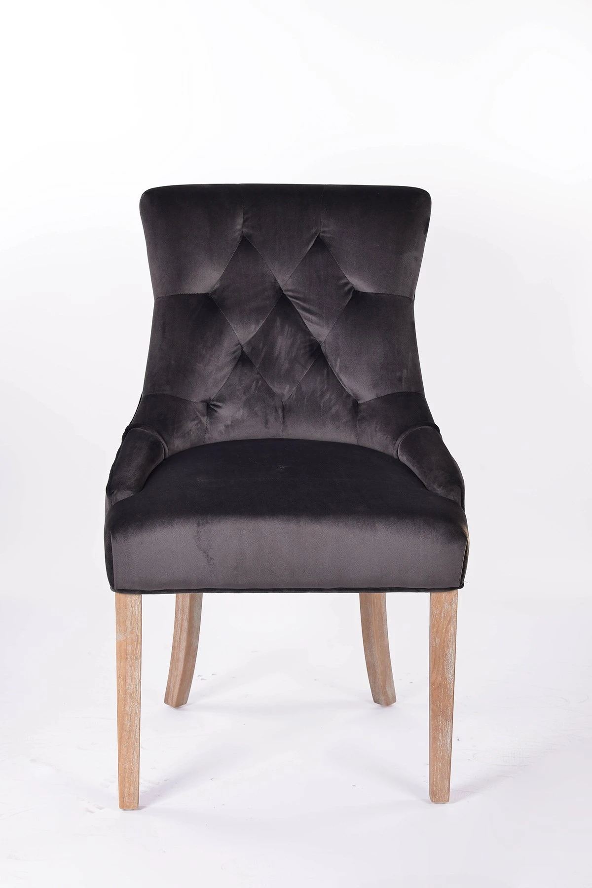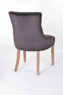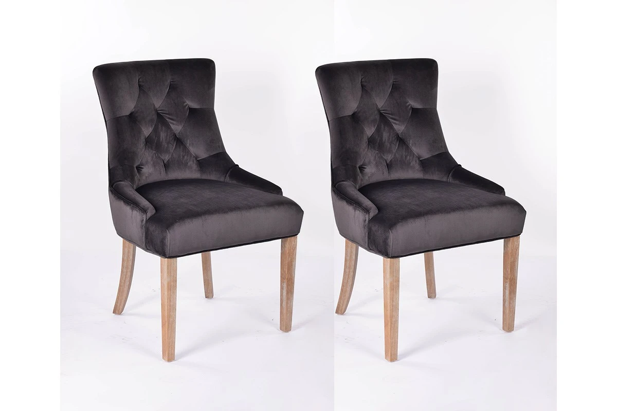BRISTOL 9702-1 is een set van 2 comfortabele stoelen met een warme, gezellige uitstraling dankzij z’n bekleding in grijs fluweel en z’n poten antiek geborsteld.