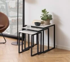 Deze nesttafel KATRINE is gemaakt van metaal en keramiek en is perfect voor een modern of traditioneel interieur. De mix van white akranes keramiek en het chromen onderstel geven de tafel een strakke uitstraling. Je kunt niet verkeerd gaan met deze nesttafel die perfect is om extra oppervlakte in je woonkamer te creëren en toch een lichte uitstraling te behouden.