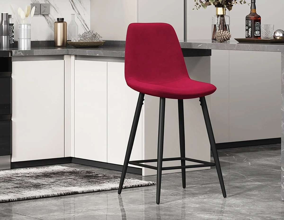 Deze set van 4 barstoelen BOY 5545 in bordeaux kleur straalt klasse uit dankzij z’n zachte fluwelen bekleding en z’n zwart metalen poten. Mogelijk in meedere kleuren. Verkocht per 4 stoelen.