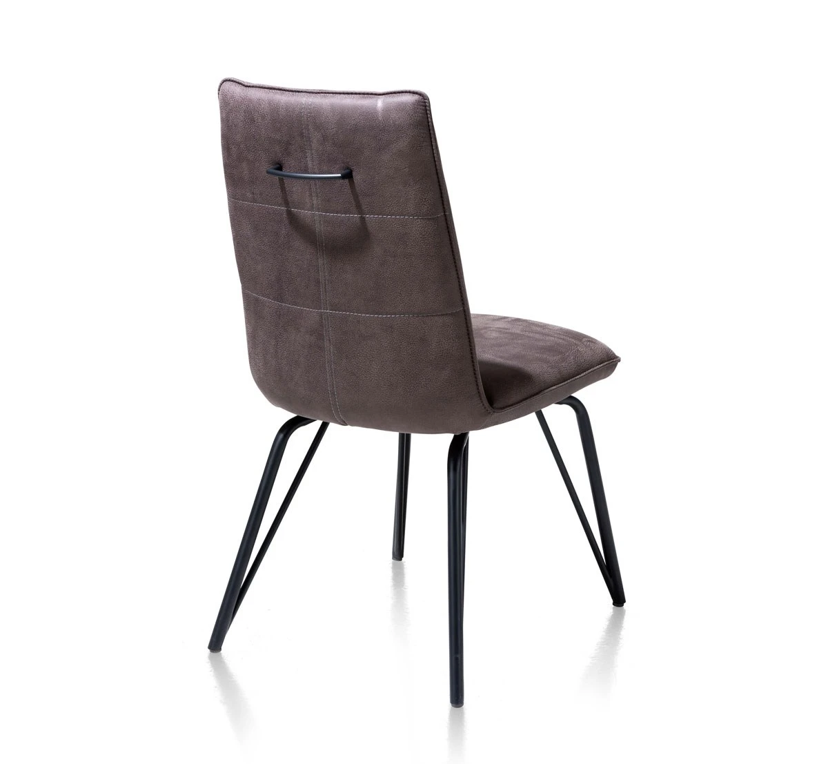 Deze mooie stoffen eetkamerstoel BELLA is mogelijk in de kleuren cognac, lava en black. In het midden van de rugleuning zit een verticale stiknaad die doorloopt naar de achterzijde. Stijlvol! De rugzijde is voorzien van een handgreep zodat je de stoel gemakkelijk kunt verplaatsen. De stoelpoten zijn gemaakt van zwart metaal.