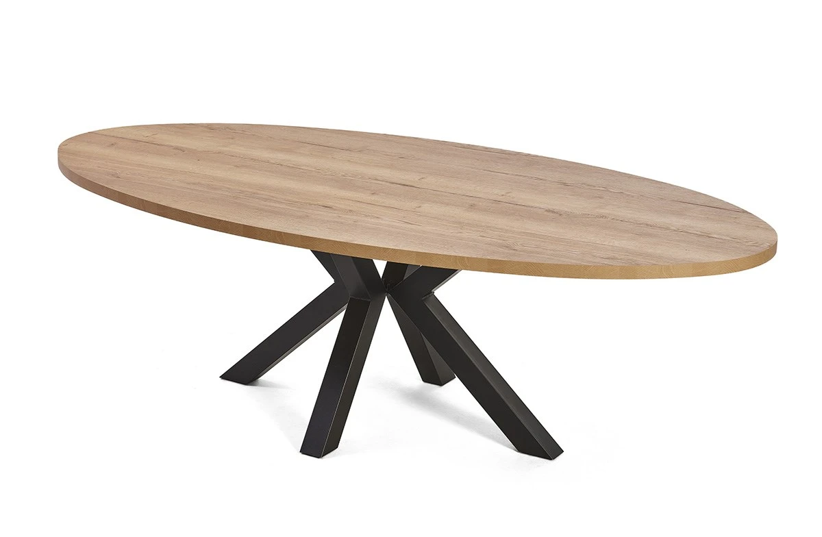 Mooie CONAN ovale tafel 250×128 cm met melamine blad in Golden Brown en zwart metalen design poot.