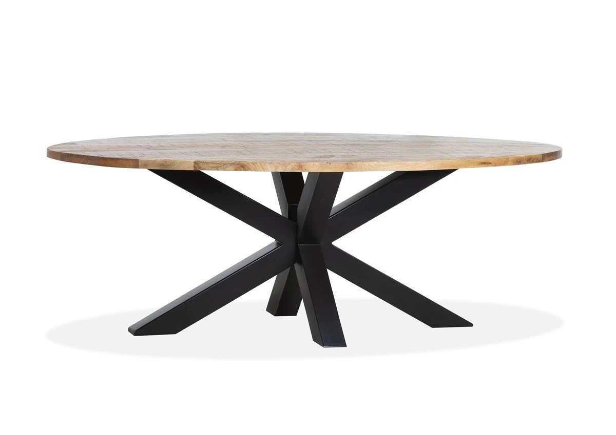 Tafel SYLVANA 240x110cm met ovale vorm is robuust met een leuk industrieel karakter. Deze eetkamertafel is gerealiseerd in mango kleur nautreel met een stalen kruispoot. Ook beschikbaar als salontafel.