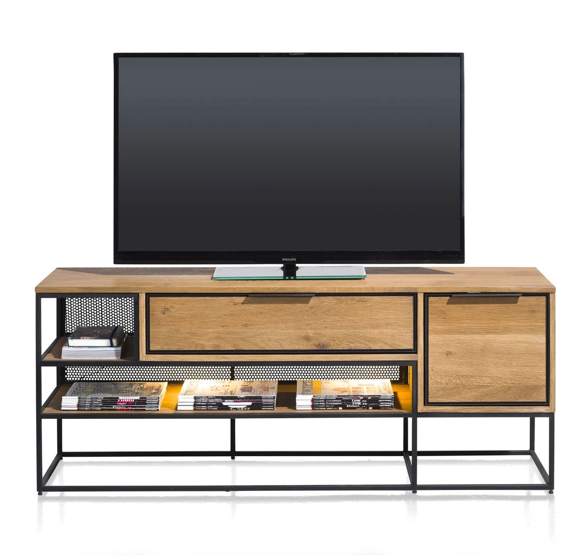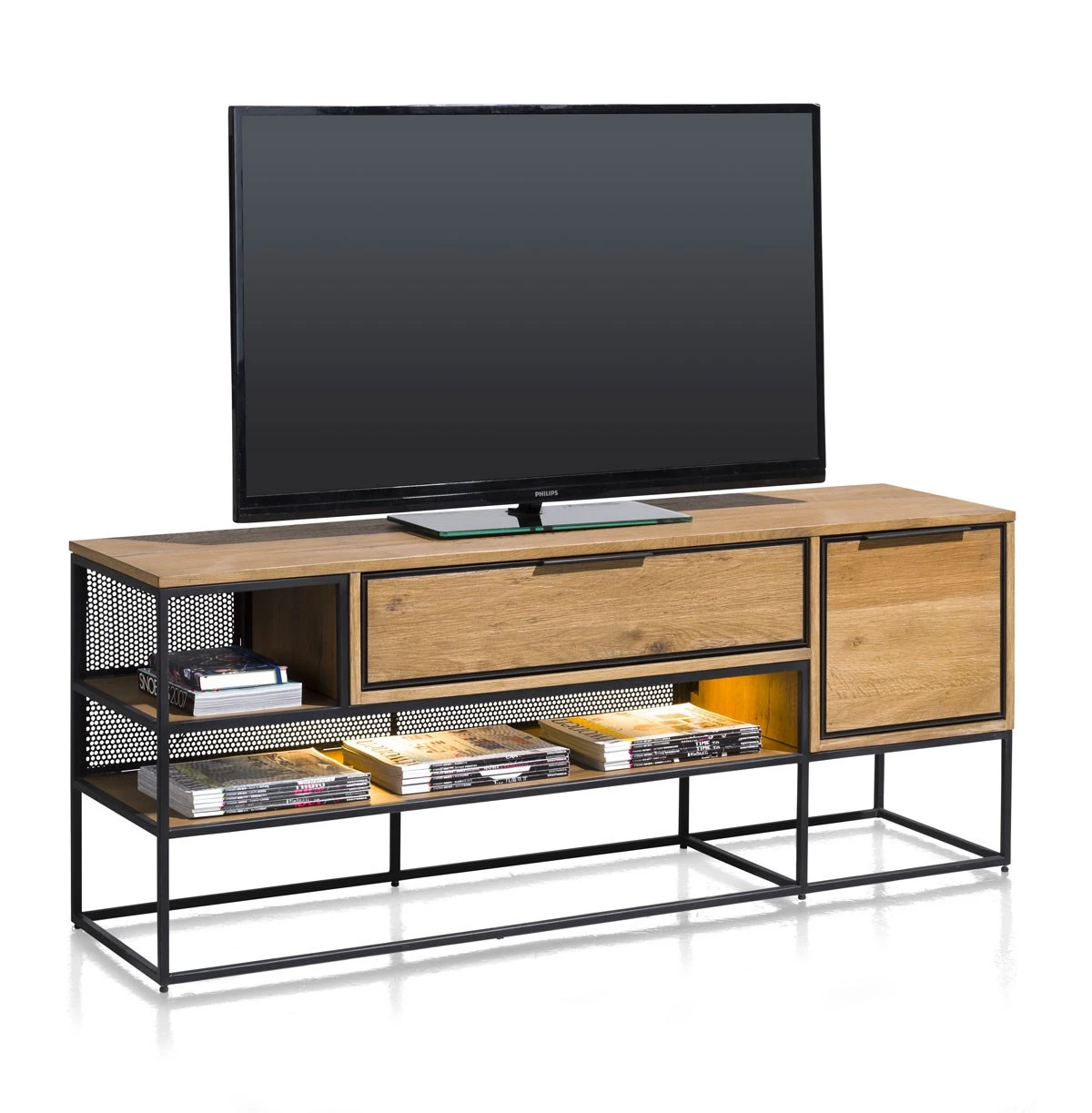 Het TV meubel CITY met een industrieel karakter vormt een ware eyecatcher in je interieur. Hij is voorzien van 1 deur, 1 lade, 2 open vakken met sfeervolle LED-verlichting. Elk meubel uit de CITY reeks is zorgvuldig gerealiseerd in fineer eikenhout kleur Railway brown. De poten in zwartkleurig metaal zorgen voor dat tikkeltje meer. Ook mogelijk in de kleur Castle antraciet met goudkleurige poten.
